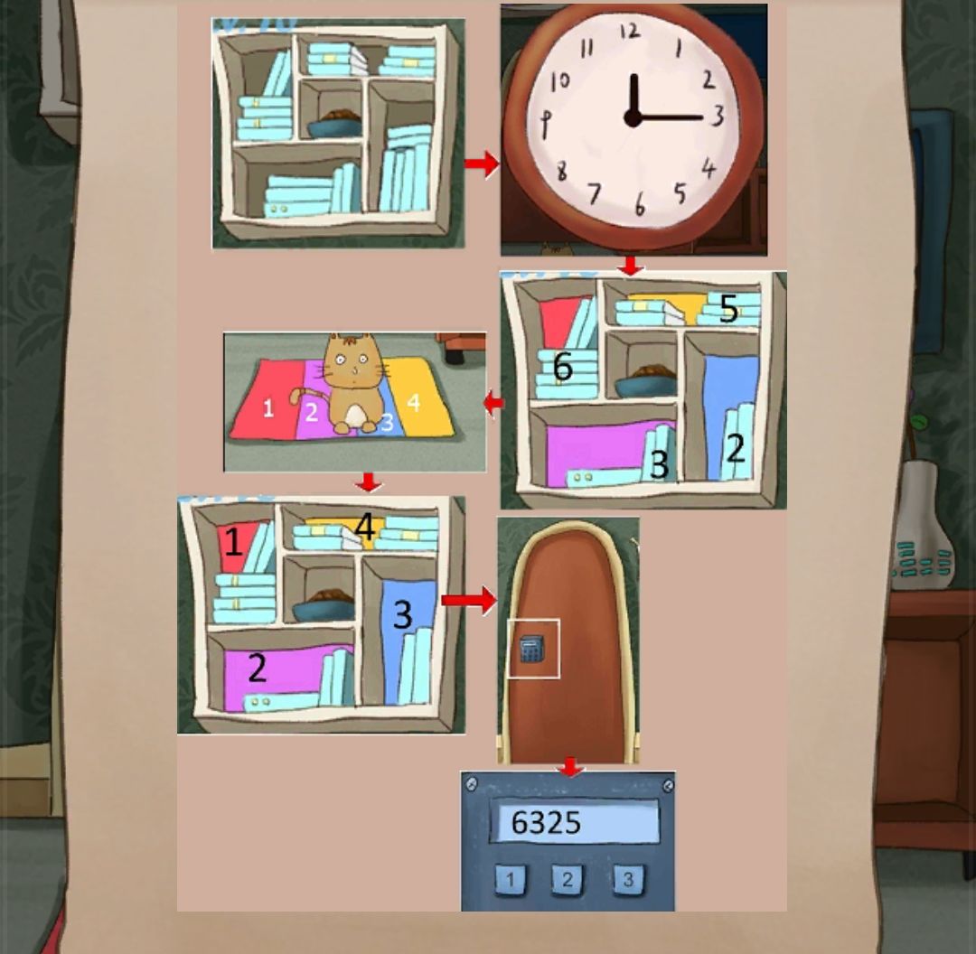 15.这关有点离谱... 花瓣数量→得到3654→打开右边的柜子→拿激光笔照柜子上的纸→得到1423→依据花瓣颜色→红蓝紫黄→解开柜子→根据纸团上的箭头顺序解开地板上的密码锁(↗↘↗↖↙↙)→得到4635→根据右上角的画→青白橘绿→得到指针安到时钟上→根据指针顺序→红蓝绿黄→4212,成功逃离~(看颜色顺序结合柜子上层数,这脑洞也是佩服,我都不知道我怎么想到的...) 16. 花瓶→1423→解第