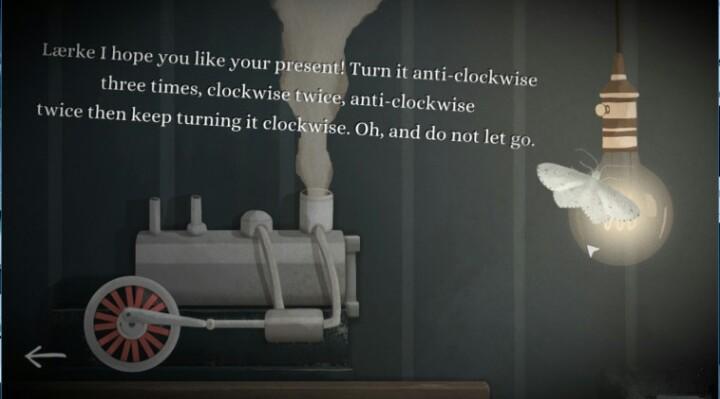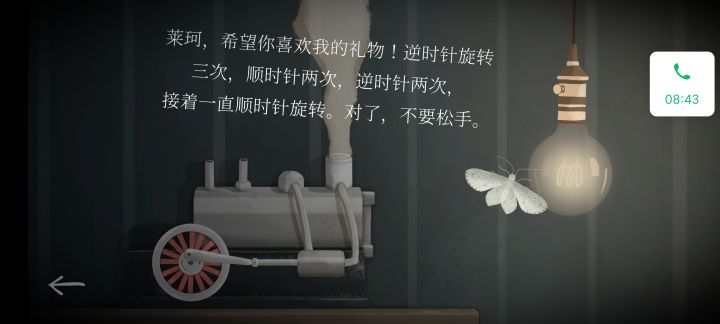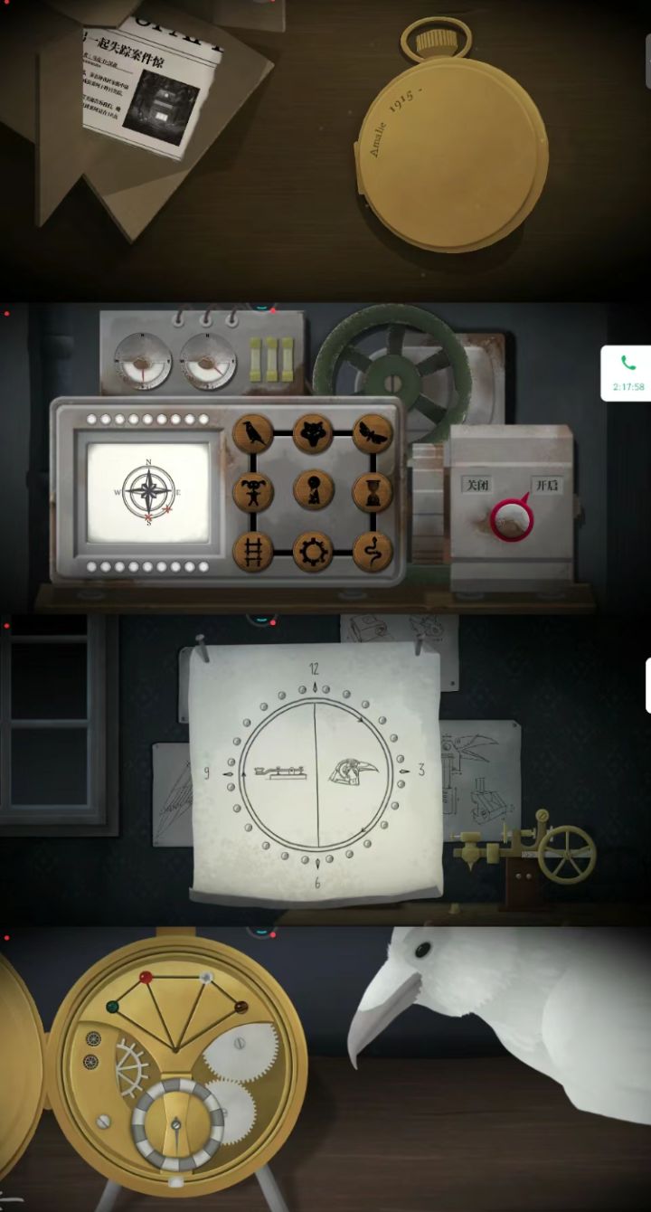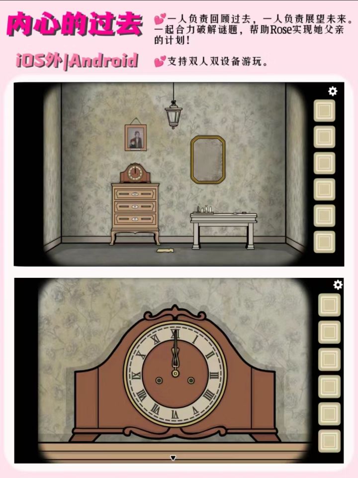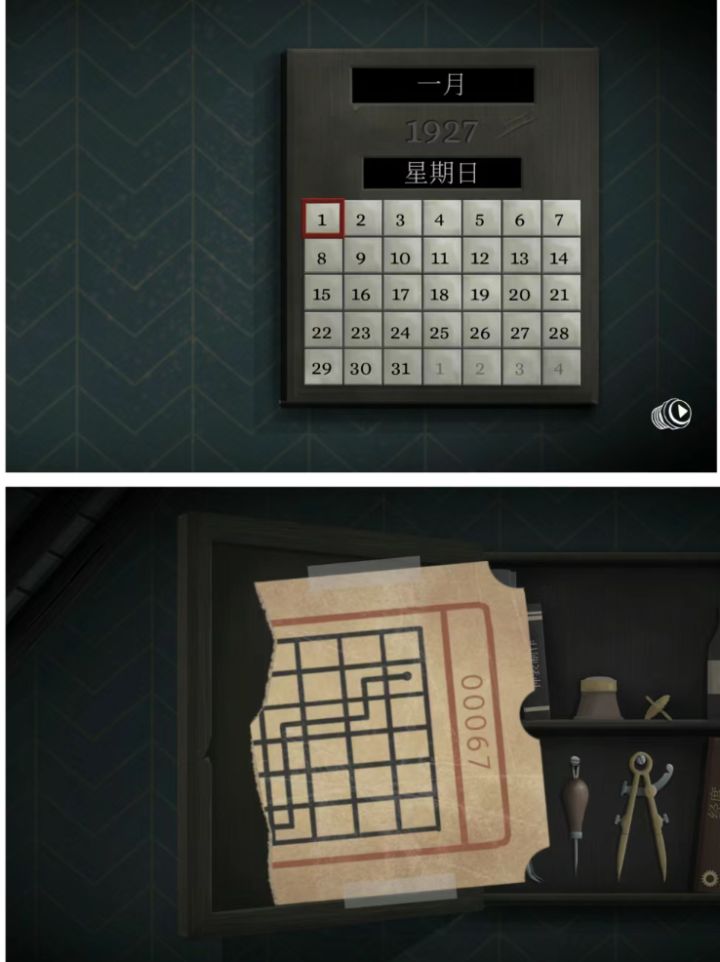 首先进入游戏,两个玩家分别选择玩家一和玩家二。进入页面后,显示的是玩游戏当天的日期,以及艾美丽给玩家的一段话。向下滑动,会出现半份报纸和一块怀表。玩家一:得知时间在十点半玩家二:得知在一个半小时后打开怀表,将时间调到12:00,随即转动发条,进入游戏。第一章时间变成1927年,钟表时间显示12:00向左滑动,是一栋别墅,点击,进入。玩家一:进入房间后,先开灯,然后在转轮子,就会获得完整的提