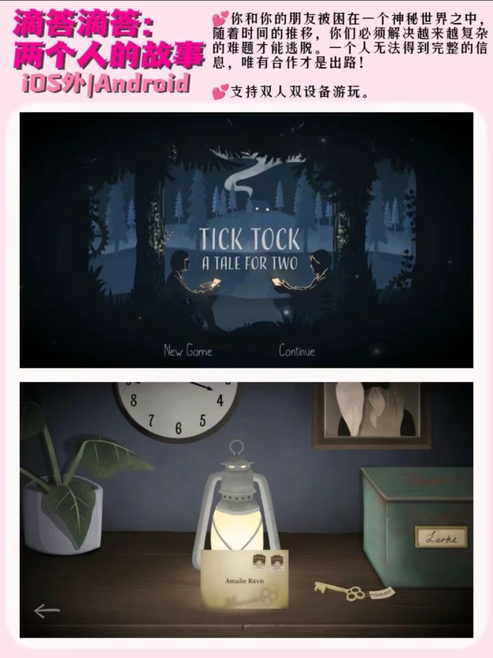 【Tick Tock】联机解密!高质量游戏!情侣手机必备!🌟女生绝对喜欢的解密游戏,氛围感拉满!画风绝佳!ε٩(๑> ₃ <)۶з🌷游戏名:Tick Tock|嘀嗒 两个人的故事🌷平台:Android|iOS|PC(三个平台可互通)🌷制作公司:other tales interactive工作室⚡简介:游戏讲述了两位玩家分别收到了一个来自艾米丽瑞文的奇怪包裹,包裹中放着信封、钟表还有仅剩