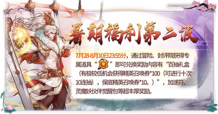 暑期福利第二波上线活动时间:7月28日-8月10日23:55分(掉落) 7月28日-8月11日23:55分(兑换)