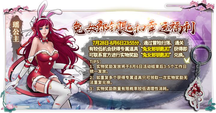 兔女郎钥匙扣实物福利上线活动掉落时间:7月28日-8月6日23:55分