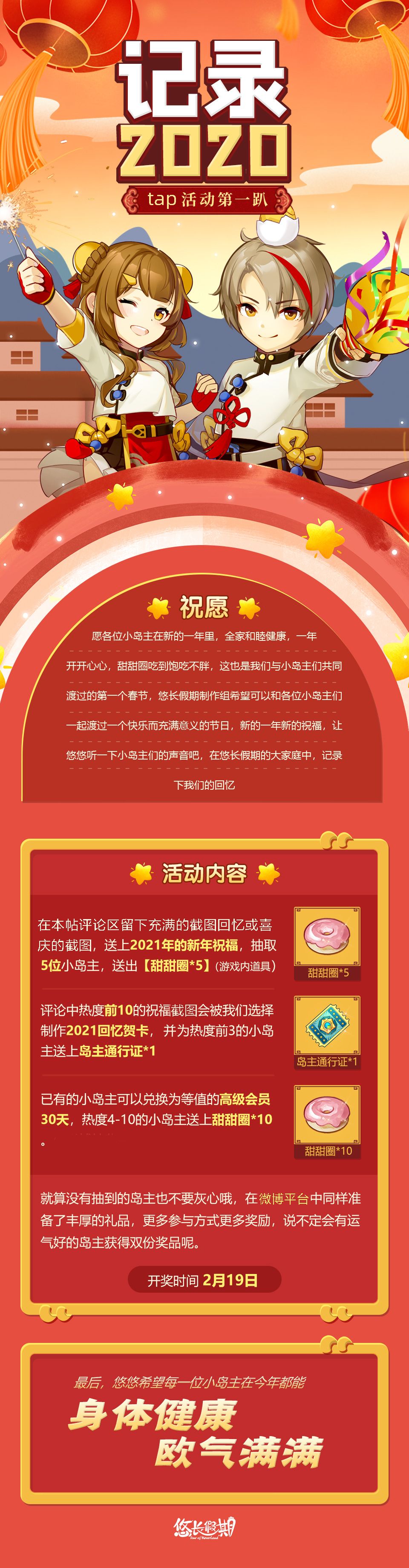 新年到,在2020中我们留下了数不清的回忆,正是这些回忆连着接我们每一位小岛主,记录2020,祝福2021,牛年运更牛,这次的奖品小岛主们千万不可错过。 在评论区留下充满在悠长假期中充满回忆的截图,或节日期间喜庆的截图,无论是合影还是单人摄影都非常欢迎! 我们将在所有发送截图的小岛主中抽取5位送上【甜甜圈*5】(游戏内道具),评论中热度前10的祝福向;回忆向截图会被我们选择制作2021回忆贺卡,并