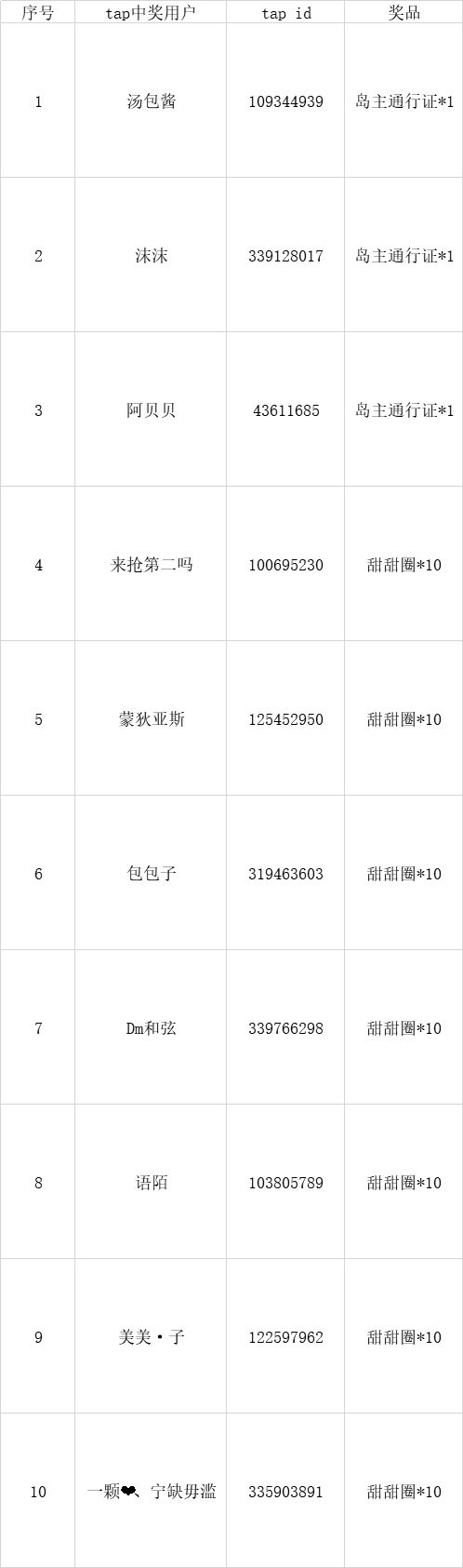 热度前十中奖用户 随机抽取5位甜甜圈中奖用户 因为tap的特殊性及为了保护小岛主的账号安全,请各位中奖的小岛主尽快将tap个人信息界面截图并私聊【悠长假期手游】微博,我们将会在此小岛主回复日期起7个工作日内发放奖品,希望小岛主们理解