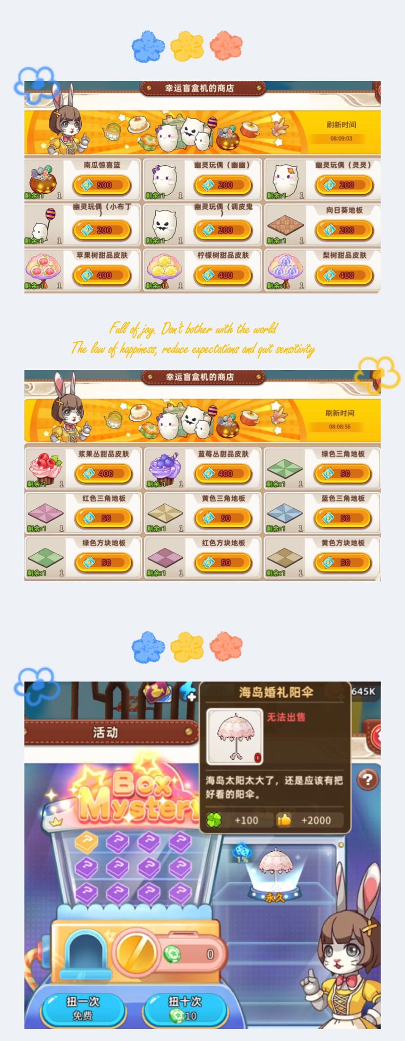 一、盲盒更新+果树机器人甜品皮肤 果树机器人皮肤,三个字我不配,一个400卷兑换,五个2000卷,200K珍珠,我看看大佬家的图就好啦! 说明:使用甜品皮肤的果树机器人在每次收获时有概率掉落对应的甜品果子。 UP物品——婚礼阳伞×10,同时盲盒机中新增4款婚礼主题装饰物:婚礼长椅、婚礼栅栏、淡粉色鲜花路和深红色鲜花路 二、美食制作(鲜花糕+4种新果汁) 这个新果汁呢,我不太明白,五个甜甜圈就250