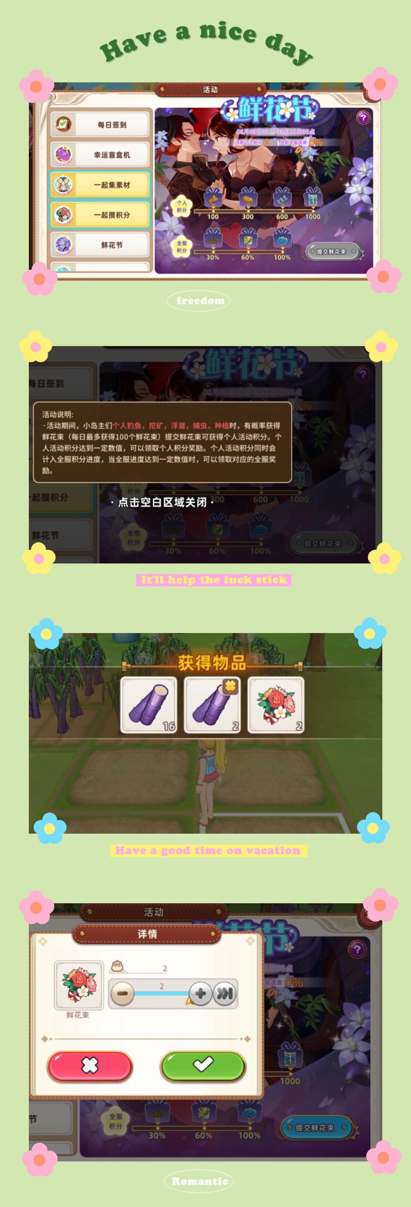 鲜花庆周年嘉年华系列 1、种植玫瑰花 当小岛主们进行个人活动,如挖矿、钓鱼、浮潜、捕虫及种植时,都有概率获得鲜花束道具,该道具可以兑换活动积分,达成相应的个人积分进度即可获得对应奖励,完成个人积分进度更能获得“蓝玫瑰屏风”。同时,个人的活动积分也会计入全服积分进度,完成全服积分进度更能获得“蓝玫瑰沙发” 2、一起集素材 活动规则:活动前2天为组队阶段,每个岛主都可以邀请一位自己的好友组成搭档。活动