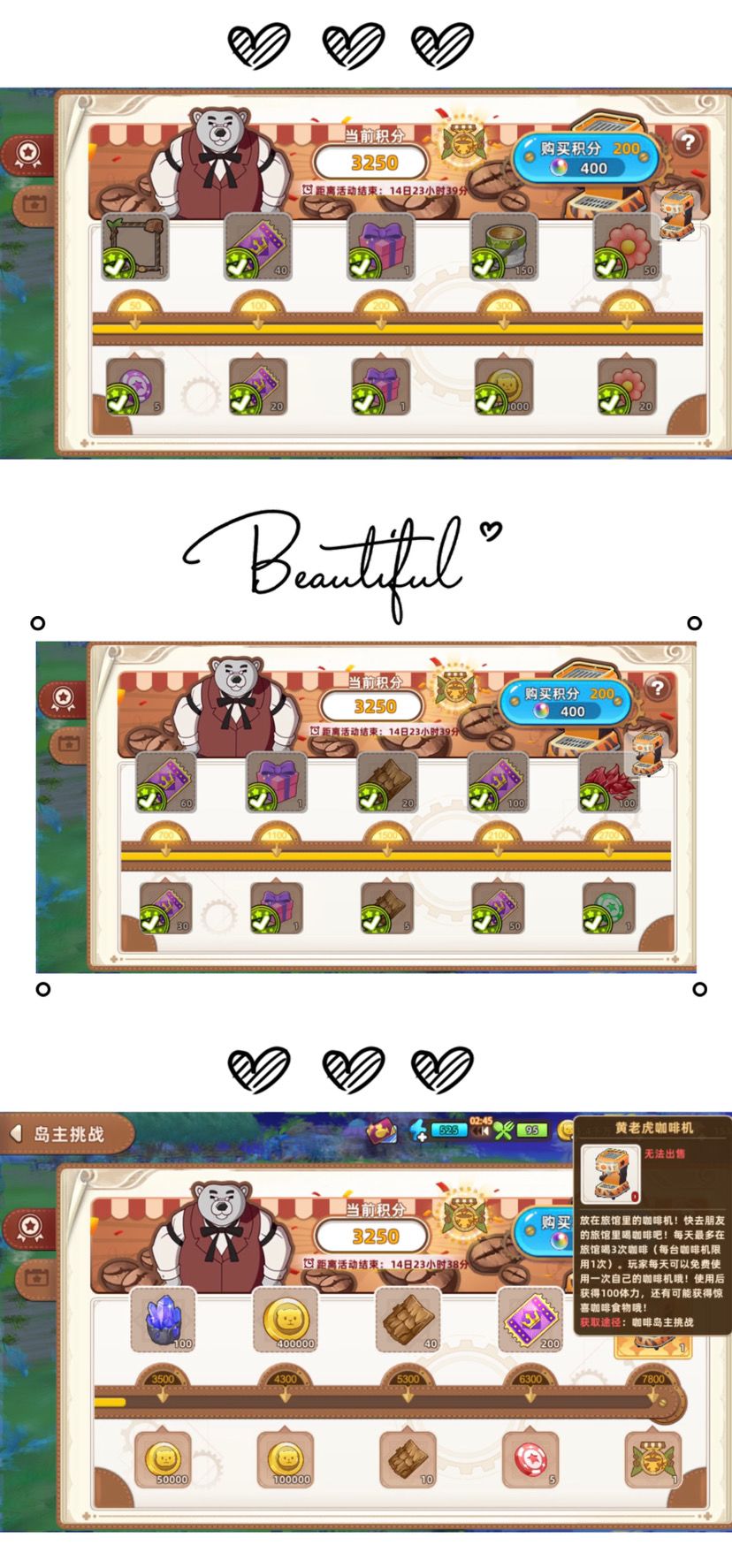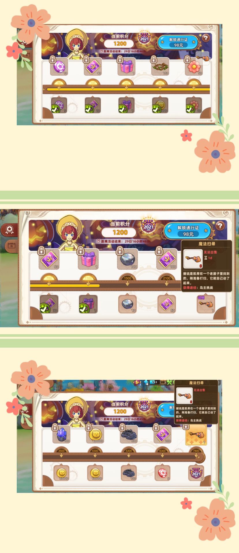 最近学校比较忙,游戏不能很好的兼顾,更新晚啦,sorry惹~ 十分感谢宅宅帮我的预告,爱你!!!吧唧~ 回归正题,让我们来看看本次的岛主,唔,固定高度,不能升空很高,速度和马还有羊驼一致,可以带宠物,喷宠可以喷喷雾(这个是唯一亮点了) 奖励方面呢,可以说一如既往的不走心,没有头像没有头像框没有装饰,只有藤条和花瓣,可是我缺树皮啊!! 任务方面呢,简单了许多,没有美食任务了,兑换任务要看清,不要换错