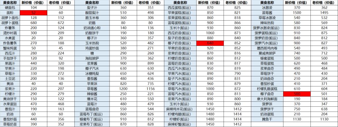 嗨嗨,我是甜甜圈!(●'◡'●) 大家最近过的还好吗?冬天记得防风保暖多屯肉哦!(●ˇ∀ˇ●) 我最近正和我的小伙伴们一起忙着准备小岛的圣诞版本内容,相信热闹的节日版本很快就能和大家见面啦! 敲黑板说重点~~听说大家很关心明天将要发布的新版本中,美食的价格究竟作了哪些调整。甜甜圈这就将新旧版本的美食价格在这里展示出来,方便大家查阅和比较!(价格皆为出售给生鲜店机器人的基础价格,部分美食无法出售则表