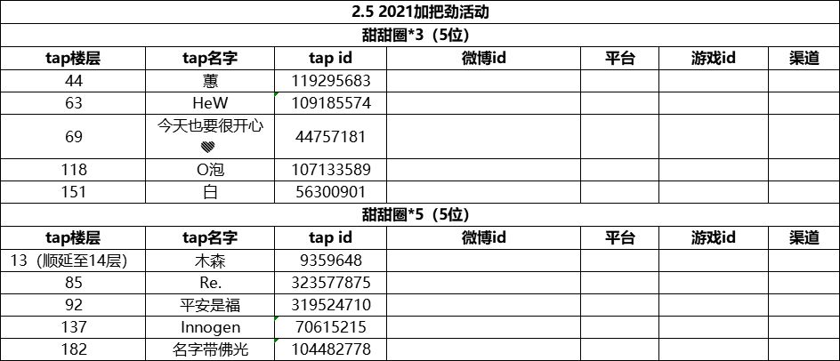 (随机数中前五位为甜甜圈*3,后五位为甜甜圈*5,随机生成,公平公正) 因为tap的特殊性及为了保护小岛主的账号安全,请各位中奖的小岛主尽快将tap个人信息界面截图并私聊【悠长假期手游】微博,我们将会在此小岛主回复日期起7个工作日内发放奖品,临近过年发奖可能比较慢,希望小岛主们理解