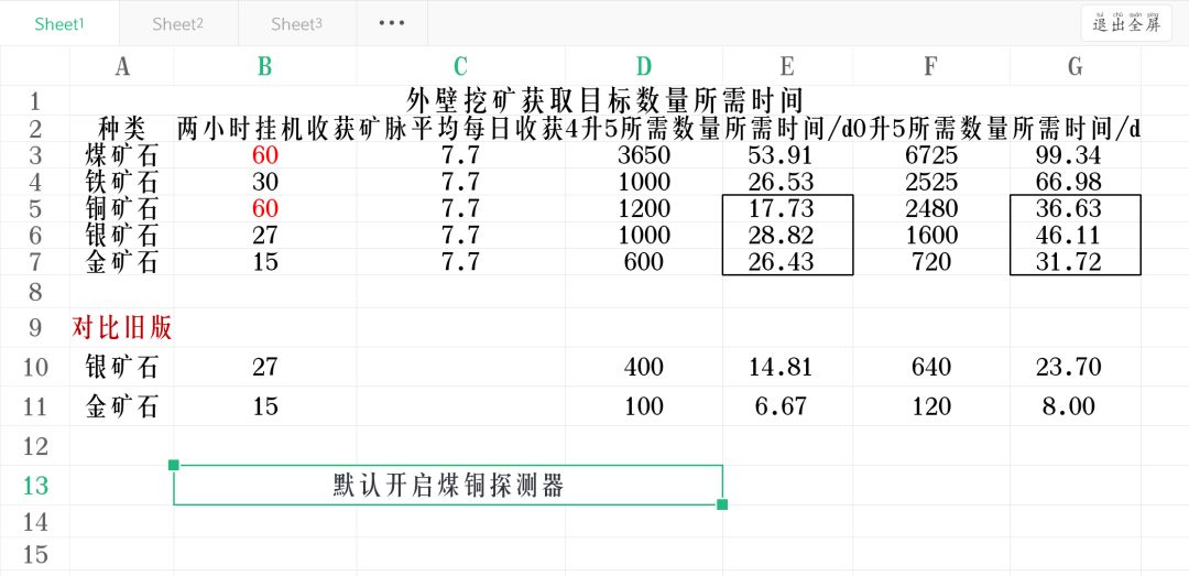好久不见,之前确实有点忙,没怎么氵帖。不过看到悠长要更新部分升星材料的调整,作为一名矿工玩家,想了一下还是得更新这点小小的攻略。 我将以新版本工具4升5所需矿石数量和0升5所需矿石数量分别作为目标🎯,计算每天挂机挖矿两小时获取数量以及矿脉平均每日矿石数量,得出完成目标🎯所需时间,来大致比较它们的获取速率。 废话不多说,直接上图 (概率采用:煤、铁、铜矿石:20%,银矿石:18%,金矿石:10%) (
