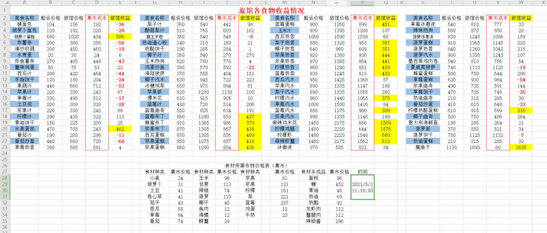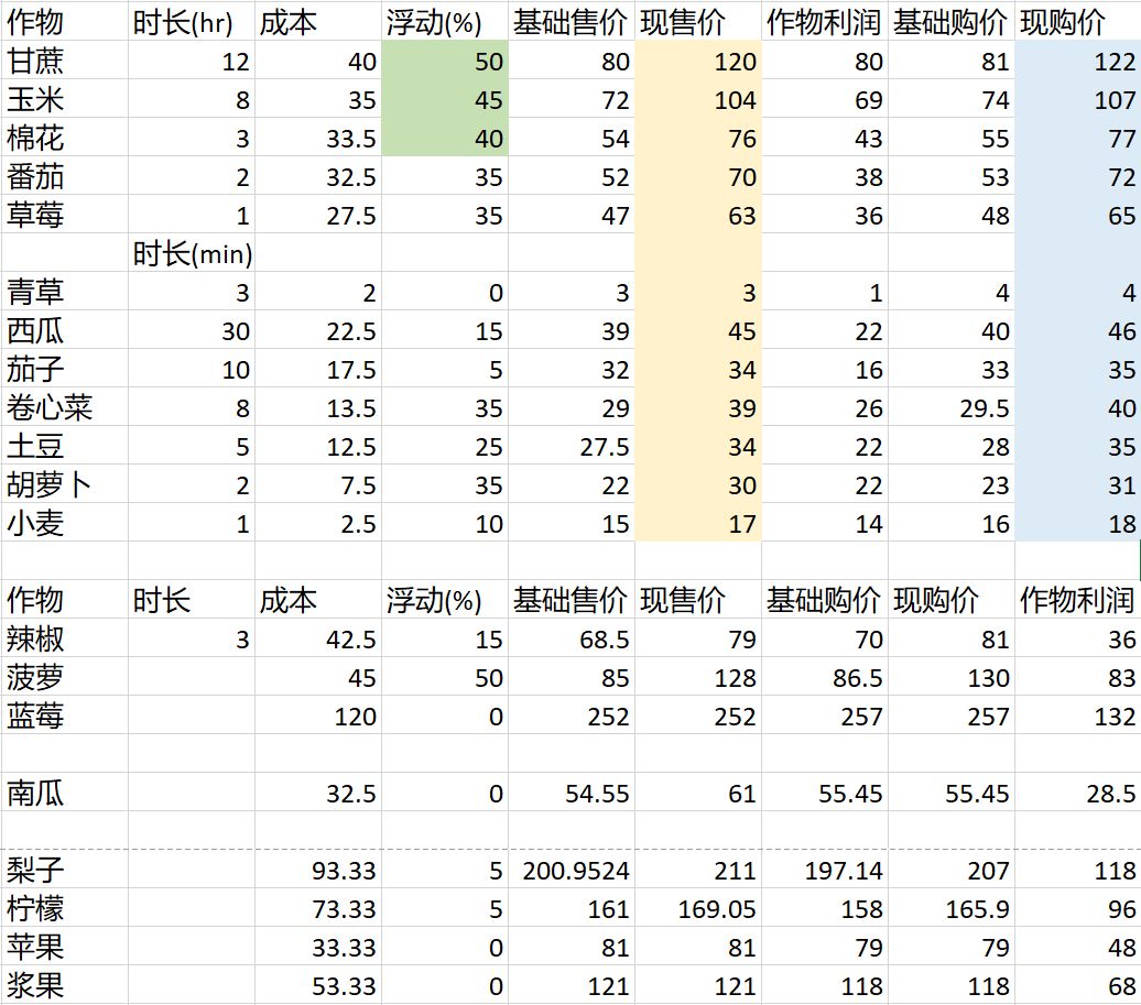 Q: 前期新手选择老老实实种菜的话(在其他工具升到四星前每日收入最多),那么到底怎么分配体力种收益最高的作物呢?作物到底是该直接买还是自己种呢?每天种菜其实赚了多少呢? A:中短期作物市场浮动高的时候种中短期,低的时候用卷心菜刷金土地种长期作物。三星镰刀三星锄子每天投入大概400点体力种菜的最高收益目前是81000。 下面新手农民开始在线做数学题。 1. 首先明确每项作物单作物收益(市场价格有浮动