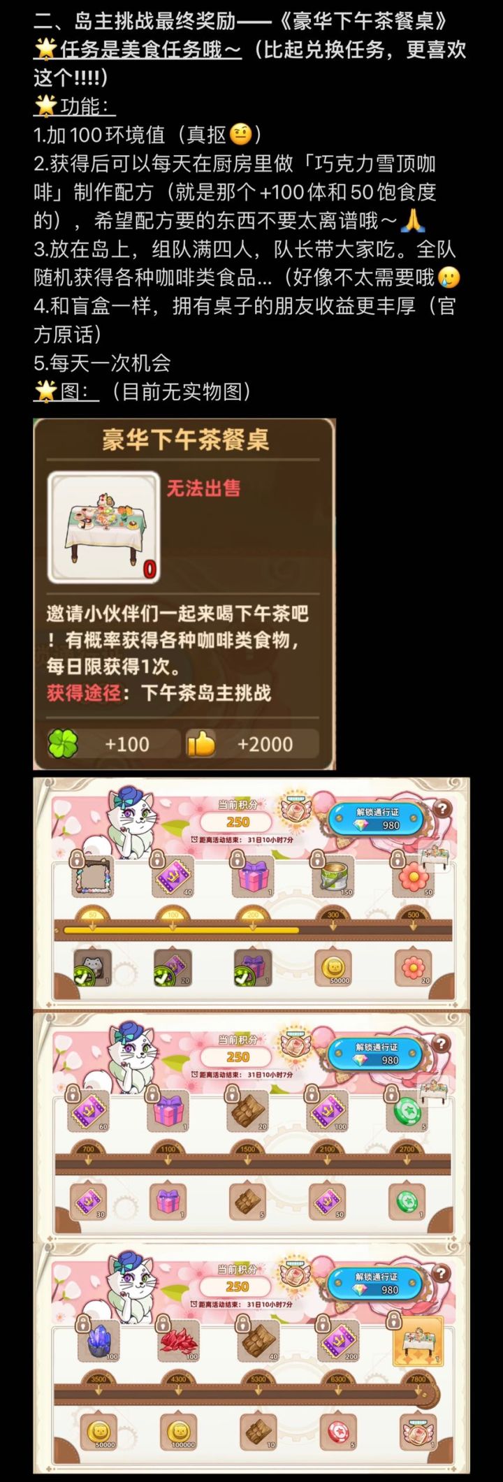 啊,A了多久也不清楚了,只记得刚买完沙滩衣服还没混过岛就A了第一届岛主刚好还在玩,虽然现在看来真的是很坑的羊驼奖励…以前直接买的樱花套装如今也放在岛主里了,那我是不是没领满奖励亏了!!!??!刚回来玩的时候真的迷茫矿天赋、摸贝这些都是没经历过的营养餐、足力健这些连听都没听过的回来一个月收获了三个可爱的固定队友也从“萌新”渐渐上手了起来记录和分享一下我的养成计划吧有一些纪念的
