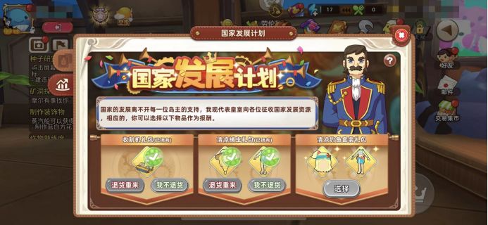 众多小岛主期盼已久的国家发展计划终于上线啦!呱唧呱唧~但是有不少小岛主仍旧对国家发展计划不是非常了解,接下来就让小管家为大家仔细介绍一下吧~首先国家发展计划是需要完成国家储粮计划才可以完成的。发展计划目前共6种礼包,我们可以在“收割机礼包”“清凉捕虫礼包”“清凉钓鱼套装礼包”中选择心仪的一个开始任务~并可按顺序解锁“清凉钓鱼套装”,“未来矿工套装”,“捕虫达人套装”。每日上交指定的物资或珍珠