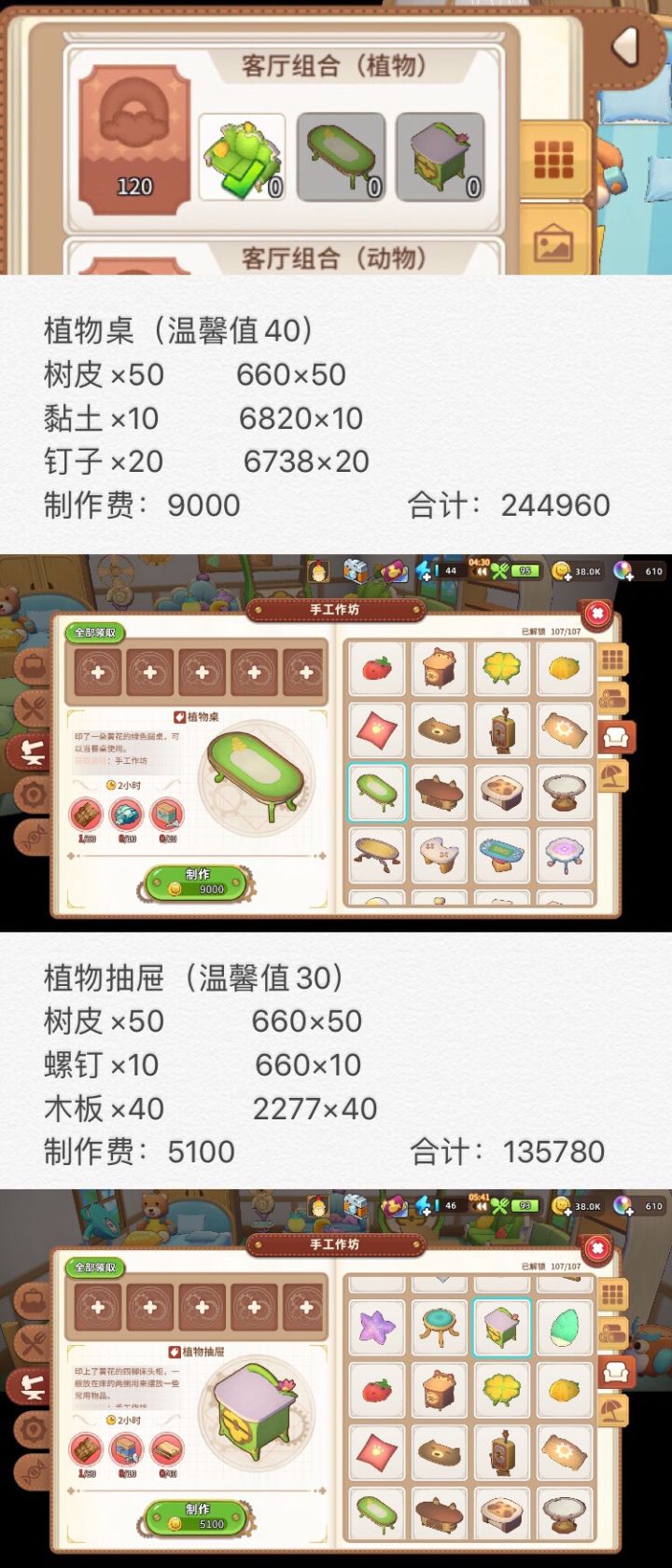 前言:以下数据仅为个人统计,如有数据错误请指出!(ps:材料价格取自集市)寻找一个同喜欢家具的你?(做家具只是因为喜爱,指望温馨值回复体力的,不值得哈)家具很多,我仅仅整理了4组比较容易做的。并且只整理了手工作坊的,有些组合有一个是村长兑换的,请自行查阅!