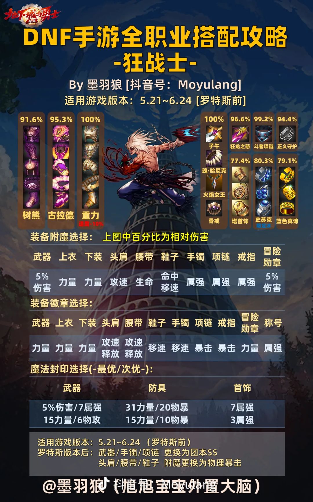 基于体验服的数据为大家整理了各职业的装备搭配供大家参考,希望能帮助各位勇士开服少走弯路,减少资源的浪费。 一、鬼泣 自带属性攻击,四个阵还有暗月降临都有辅助效果,定位辅C职业,适合氪度不高的玩家。鬼泣属于布甲职业,身板很脆,因此推荐用 女装+蓝色真谛+无影剑 不仅弥补了鬼泣身板脆的缺点,无影剑的30白字更能提高输出上限。 二、狂战士 狂战士需要骨戒,还需要打属性攻击卡,属于纯输出职业,因此推荐火套