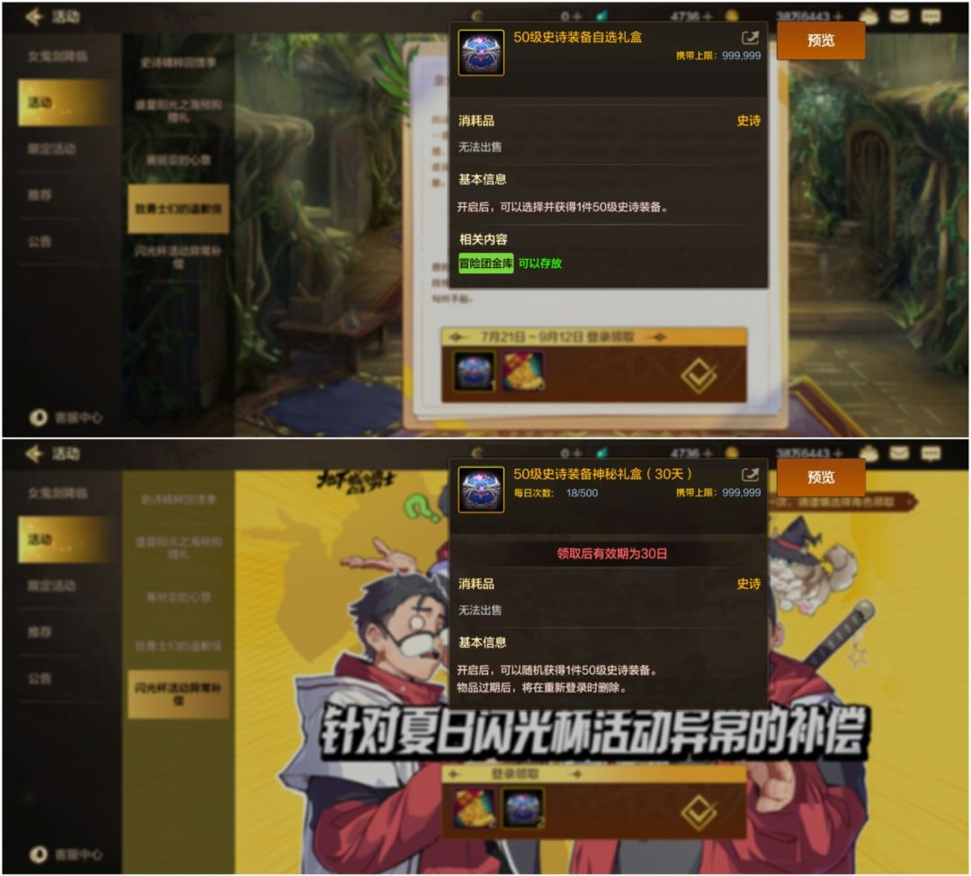 DNF手游目前已经进入短暂的长草期,8.28女鬼剑新职业的加入适当的缓解了这种情况,加之各种助力升级的福利活动,正是新玩家入坑以及打造新角色的好时机,今天主要讲解一下新创角色该如何利用活动快速赶进度。 一、对于新入坑玩家额外的小提议——开局即超越大多数玩家! 在活动中,有一项比较强力的福利,可以直接领取50级史诗礼盒! 该补偿加起来足足赠送了3个史诗礼盒,虽然有两个礼盒是随机礼盒,产出史诗装备随机