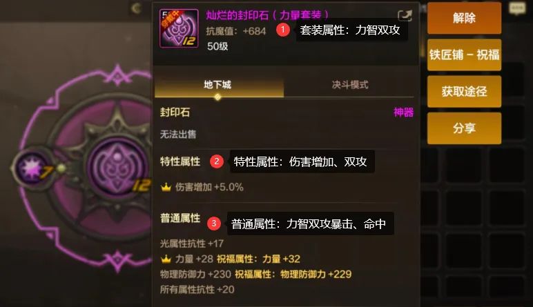 “封印石”可以说是这个版本最难毕业的细节之一,但即便如此,也依旧有许多欧皇一发入魂,直接开出了完美属性! 首先我们说一下,一块完美的封印石应该具备哪些属性呢? 首先基础的“套装属性”和“特性词条”这2个大词条必须完美; 第二、普通属性中需要具备“2个伤害词条+1个命中词条”, 这个“命中”特别关键,因为它是非输出词条中唯一可以带来伤害增加的; 第三、后续的2次“祝福属性”,也必须祝福到输出词条上!