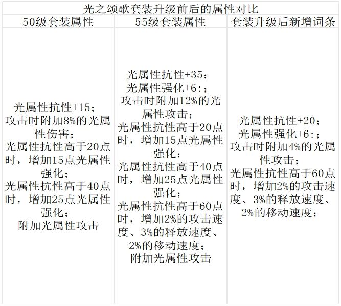 9.25号版本更新后将推出50史诗防具升级为55史诗防具,在原有的套装基础上加强属性,整体增幅在9%左右,但每个套装的升级后的真实提升率却不同,因为每个套装的基础属性不同,伤害稀释的程度也就不一样,那么升级后热门套装属性真实提升率排序点评如下! 1、光之颂歌套装 升级后提升率约为7.3%左右(只计算光属性白字加成下总伤害) 计算:升级前套装抗性25,进入地图后光强为15+8=23;升级后套装抗