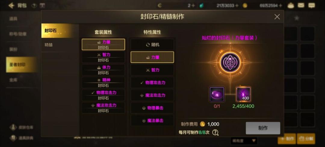 圣者封印系统在10月10日迎来的新版本的改动,除了制作页面优化,也带来了实用性的提升,不仅仅体现在抗魔值大幅度的提升,也直接将面板提升了一大截,那么今天来看看新版的圣者封印系统都有哪些便利性的改动,以及属性到底提升了多少。 一、制作页面优化以及新增自选特性属性功能上线 在制作页面,可以自选“套装属性”和“特性属性”,套装属性可以生成套装属性效果,通常我们选择“力量/智力”或“物理攻击力/魔法攻