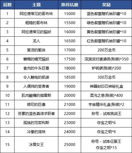 【基础介绍】 试炼之塔是限时开放的高难爬塔副本。 第一期开放时间为7月24日维护后,结束时间请关注后续官方公告。 入场等级为55级,最低入场抗魔值为15000,层数越高所需抗魔值越高。 【塔的情报与奖励】 试炼之塔共拥有15层,为迷妄之塔的精选版,每层通关都能获得对应奖励。1~15层主题、所需抗魔值与通关奖励如下。 【特殊机制:冒险团助益】 在入场界面处,可以配置冒险团角色增加属性,只能配置55级