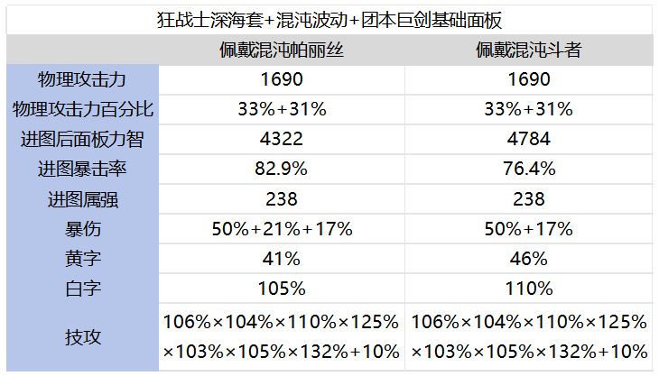 狂战士使用团本武器带来的提升并不大,甚至出现负提升现象,那么该如何化解这一处境呢?有小伙伴悄悄告诉笔者,团武+深海的情况下使用混沌:帕丽丝的家族象征伤害会更高!笔者对此也是进行了计算与实测,接下来就告诉勇士们答案。 【对比模板计算】 以下模板使用帕丽丝与斗者时更换了团本勋章与武器徽章: (1)深海+混沌波动+团本巨剑+混沌帕丽丝(未计入异常伤害) ①技能占比: 0暴击数值:(4322÷25