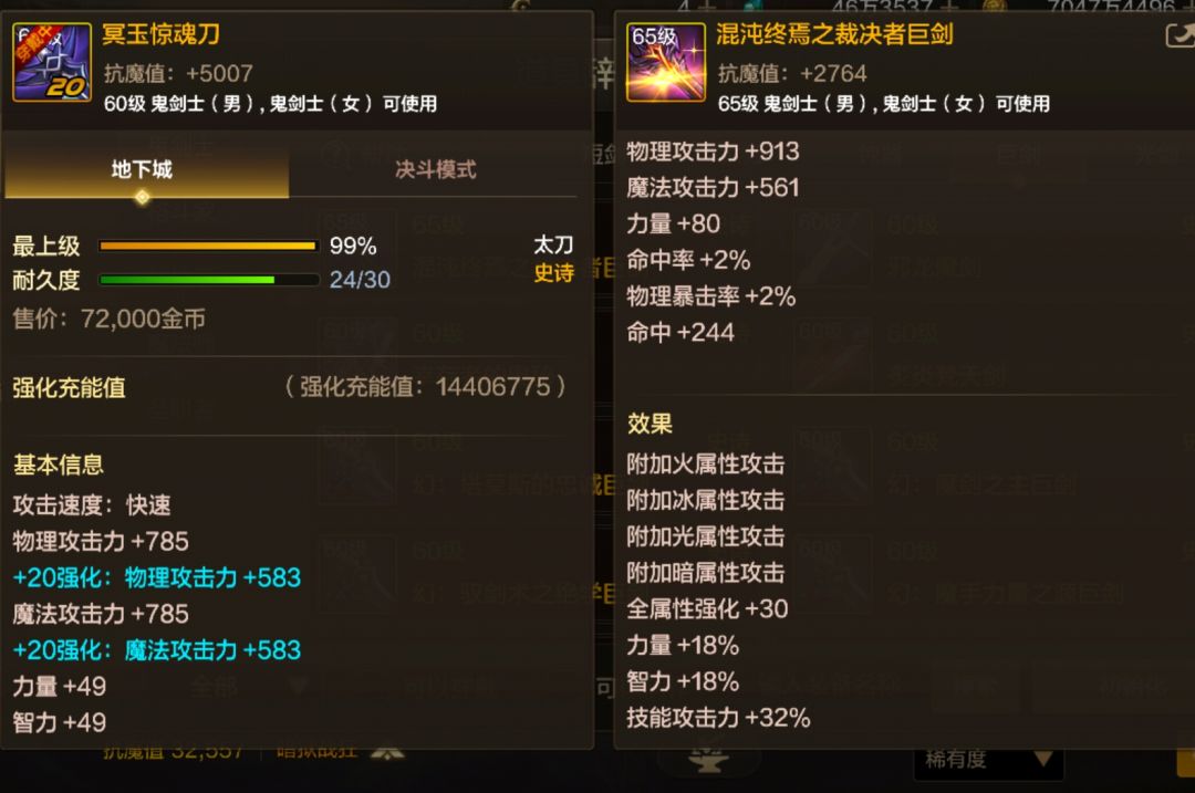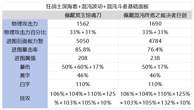 大多数玩家的团本武器在本周已经制作出来,笔者也是看到许多小伙伴评论说,狂战士的团巨对比冥刀而言是负提升,没必要继承团巨,那么事实果真如此吗?今天笔者也将对此进行深入分析。 【对比模板】 以下对比模板中团本勋章,武器徽章进行了更换,冥刀使用暴击,团巨使用力量: (1)冥玉惊魂刀+深海+混沌波动+混沌斗者 技能占比: 0暴击数值:(5050÷250+1)×1562×(1+64%)×[1.05+