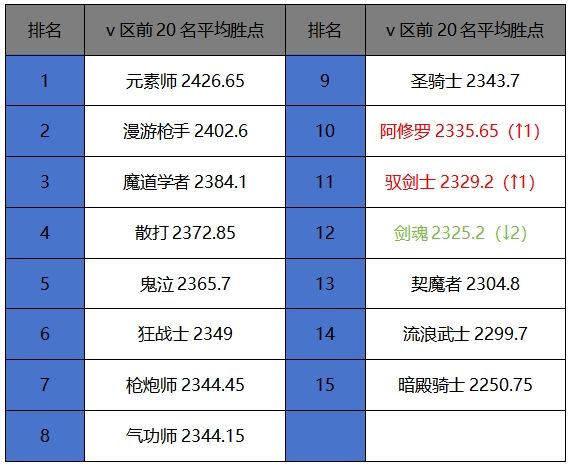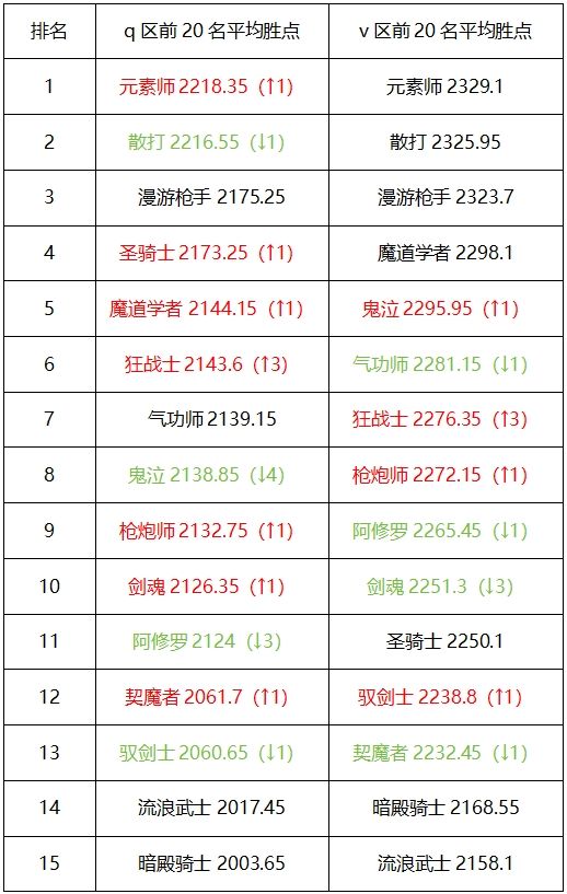 一、决斗排行榜职业强度排名(截止于11) 备注:数据截止于09.11 评论下本周排行榜变动,还是受上月28号改版影响,狂战士排名下降幅度明显,没了大技能起手霸体,让上限低下限高的狂战士下限也变低了;反观枪炮师进步明显,看来策划对枪炮师一系列的手感优化是良性的调整,大大提高了枪炮师的pk强度;元素师依旧一骑绝尘,pk前20平均分来到了惊人的2403.5,这平均分给别的职业都能当榜一,离谱 决斗场马上