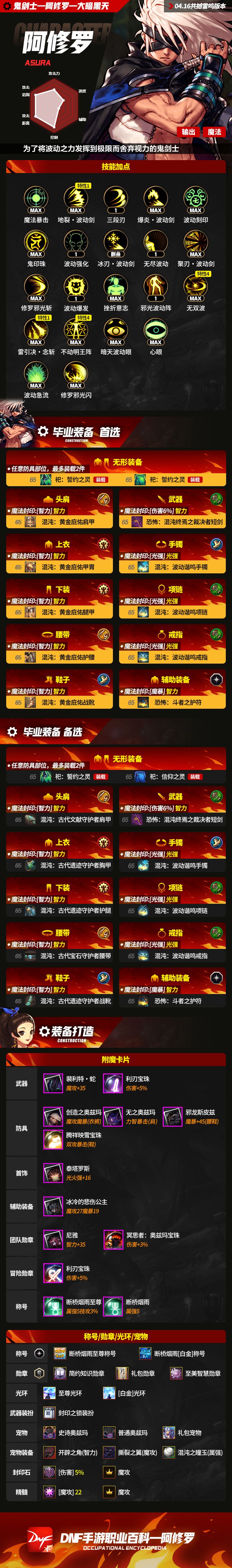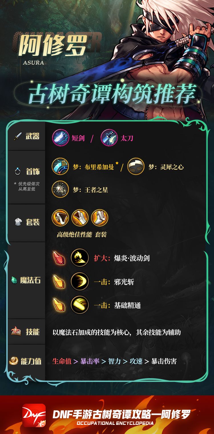 阿修罗职业打造前瞻 阿修罗,绰号瞎子,号称平民之光,一个不需要多高打造就能驰骋搬砖界的神奇职业,很多玩家都准备了一个49的鬼剑士职业,期待着等新职业上线直接转职,甚至有的玩家把天空套之类的都准备好了,本篇文章呢给大家讲讲阿修罗的装备和技能要点,大家要认真记哦 【职业介绍】这是官网对阿修罗的介绍,结合公测版本以及体验服实际,阿修罗更适合的武器是短剑,相信很多玩过狂战士的玩家都知道,这版本面板对职业的