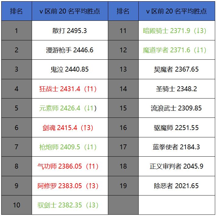 一、决斗排行榜职业强度排名 备注:数据截止于11.30 65版本第一个赛季开启,经过一些列pk平衡,漫游枪手和元素师强度都得到了一定的削弱,狂战士等弱势职业虽然进行了一定量的增强,但是对这些职业当前强度影响并不是很大,策划现在调整职业强度的时候都不敢大刀阔斧的进行改进了,每次都是增强或者削弱一点点 赛季初各职业pk强度的排名还是比较真实的,一个职业如果是真的强势,那么在赛季初也是会更容易的脱颖