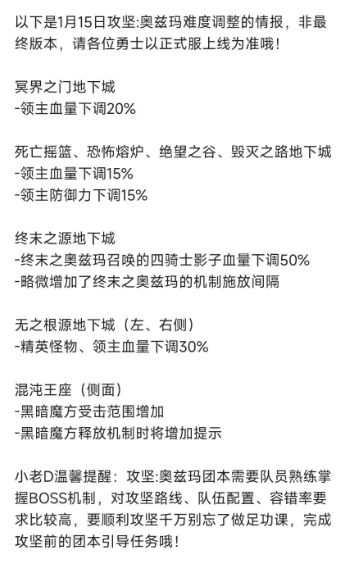 小老D在1月13日攻坚第一天上线的晚上发布了团本难度下调的公告,于1月15日下调!许多玩家对此表示宝宝巴士回归,那么事实果真如此吗?又如何避免下调后炸团呢?下列将对此进行分析。 一、团本难度下调 小老D已经发布团本难度下调公告,且于1月15日周三进行攻坚模式难度下调。许多炸团的玩家以及带小号的玩家可以继续进行攻坚模式,且更容易通关。但同样的也激起了部分玩家的抗议,毕竟之前喊“宝宝巴士”的有很大