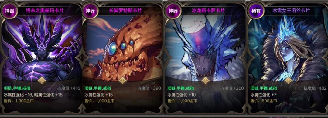 兄弟们,四大属强附魔推荐来了,速来看看你毕业了吗? 【一】冰强 〔1〕终末之奥兹玛卡片:冰/暗16、抗魔416、泰拉12.5万。 〔2〕长脚罗特斯卡片:冰15、抗魔390、泰拉11万。 〔3〕冰龙斯卡萨卡片:冰10、抗魔260、泰拉3.9万。 〔4〕冰雪女王洛丝卡片:冰7、抗魔182、泰拉500。 【二】火强 〔1〕泰塔罗斯卡片:火/光16、抗魔416、泰拉28万。 〔2〕突击队长兰蒂卢斯