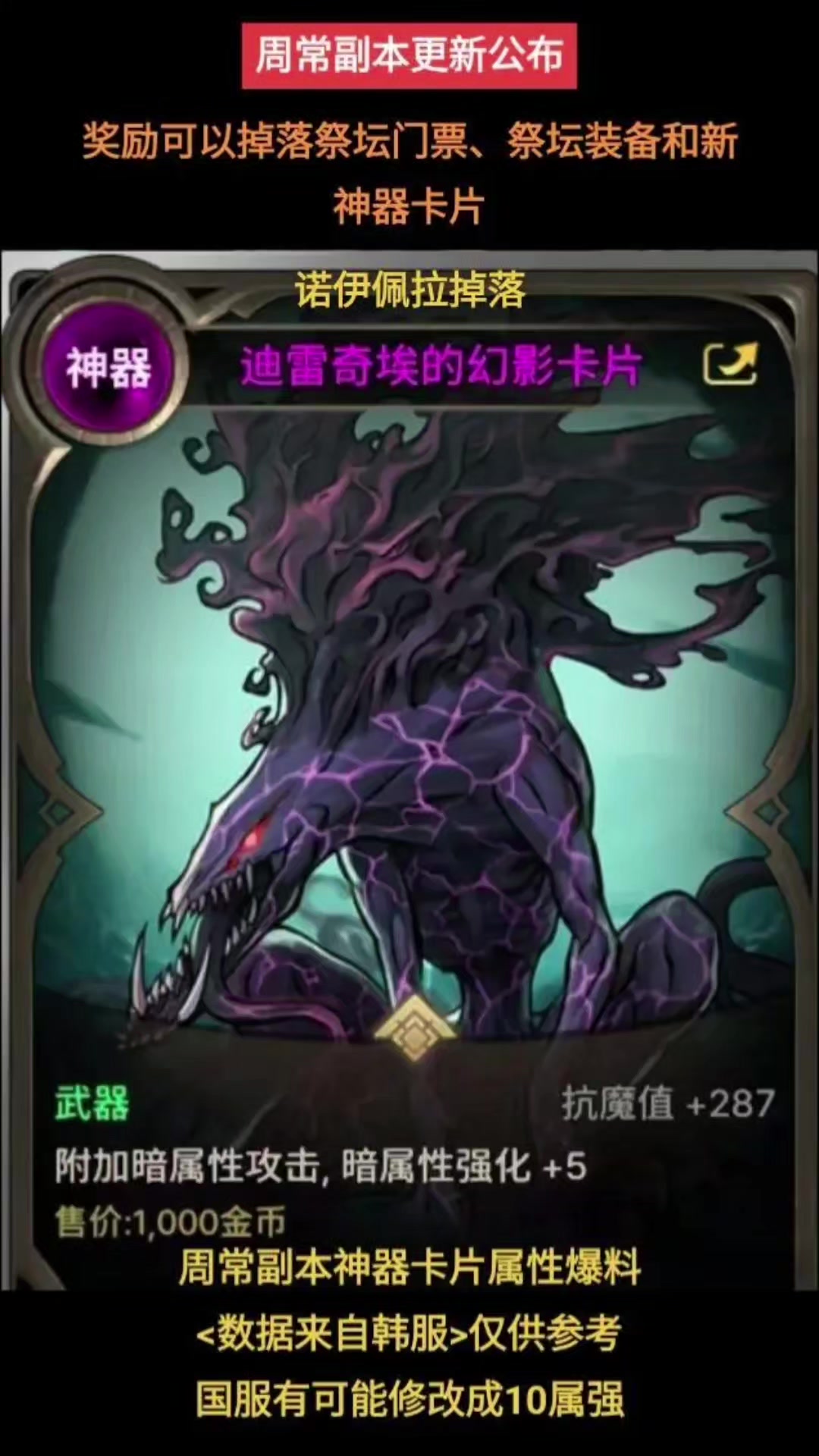 DNF手游周常副本神器卡片属性爆料,数据来自韩服,仅供参考