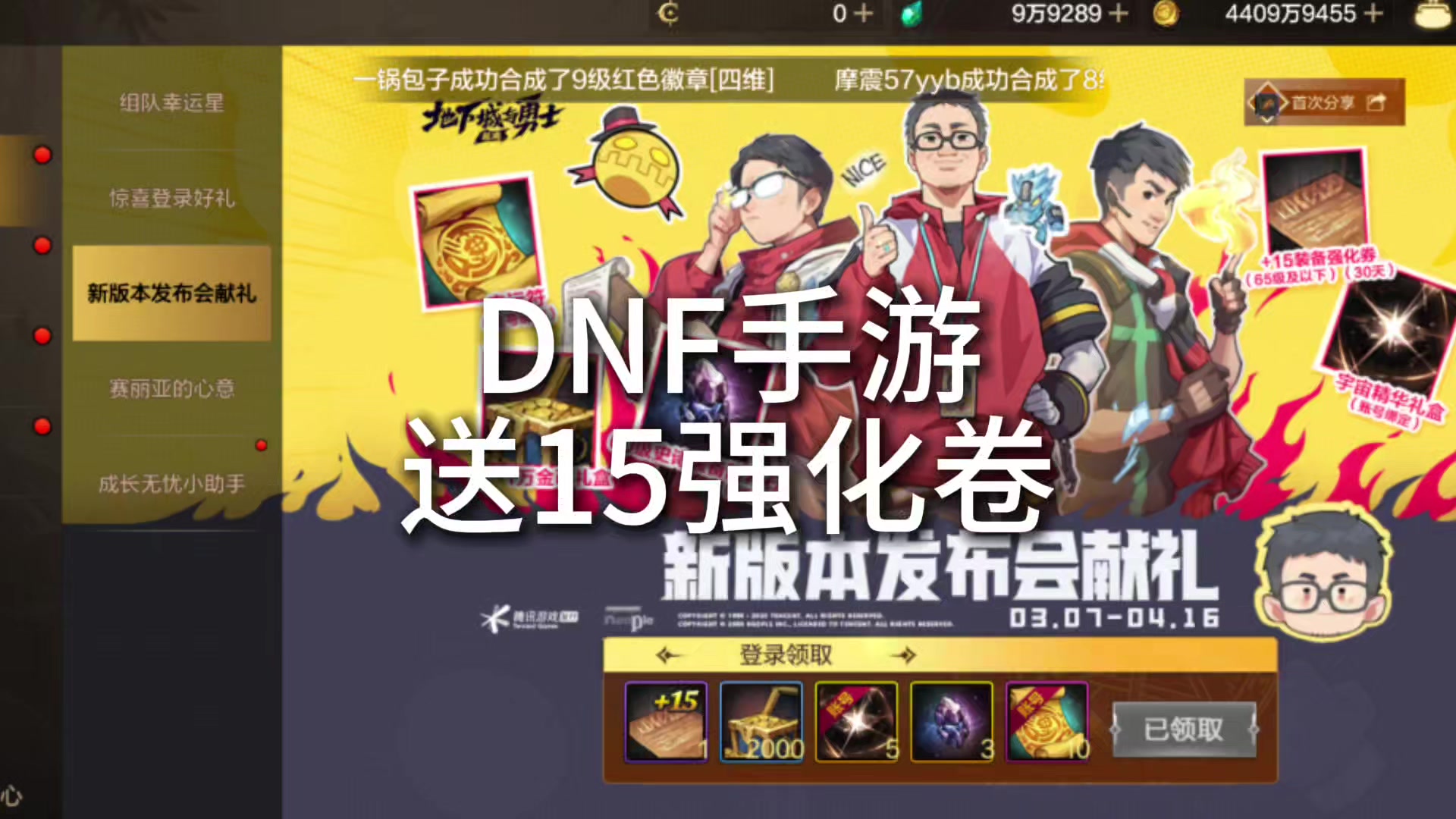 DNF手游送加15强化卷。