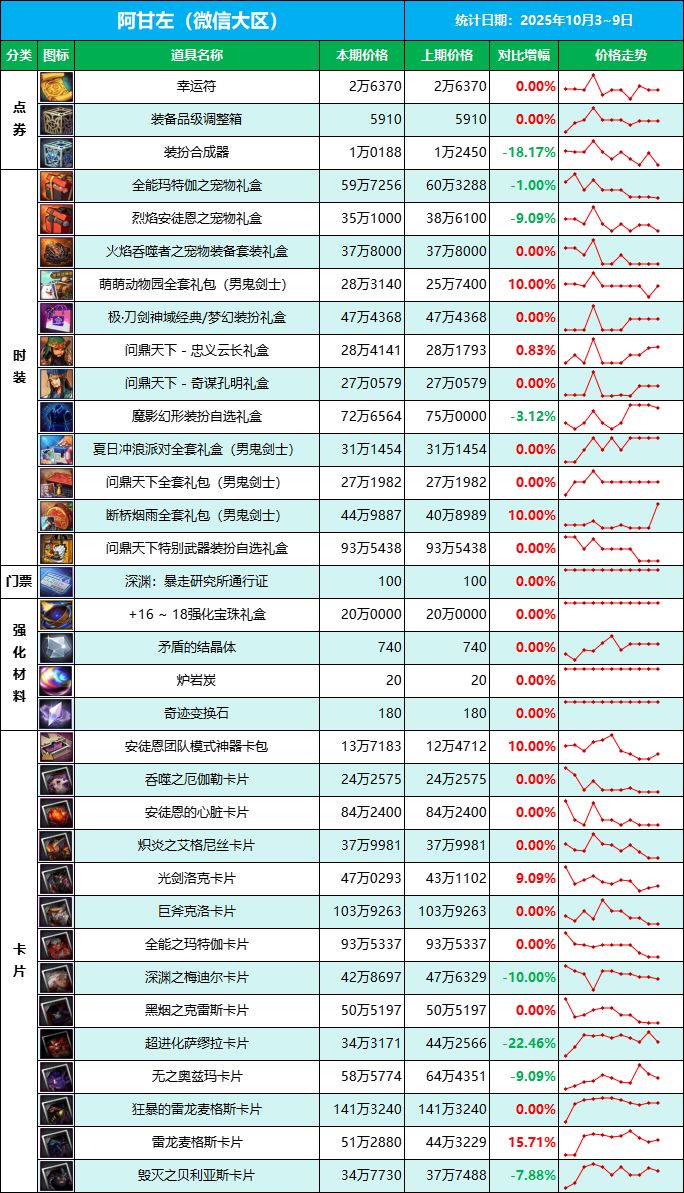◆统计时间:2025年10月9日◆统计区服:微信区(阿甘左)、QQ区(克拉赫)◆本统计价格意在探讨交流用,无其他任何商业目的,请勿以表格中的数据定价,另手游物价浮动不大,价格无明显变化的,走势图中将不再展示。◆微信区- 尝试从3号开始统计每日物价变化,最后呈现的走势图非常有趣,涨价高峰期出现在6号前后,进入8号价格逐渐下跌,部分道具回落到节前价格,在售数量大幅减少,其中宠物礼盒降价幅度