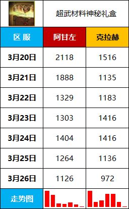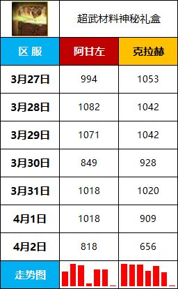统计时间:2026年3月27~4月2日(7天)统计区服:微信区(阿甘左)、QQ区(克拉赫)本统计价格意在探讨交流用,无其他任何商业目的,文中所述建议仅供参考,请结合实际情况自行判断,另市场变化较大,最终价格请以所在区服的实际价格为准。 【参考/建议】上周就提醒过,超武盒子会越来越便宜,产量影响价格,按走势预计未来一周还会继续下跌,即便有新职业登场也很难拉动价格,因为新职业必然有活