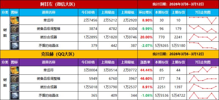 统计时间:2026年3月6~3月12日(7天)统计区服:微信区(阿甘左)、QQ区(克拉赫)本统计价格意在探讨交流用,无其他任何商业目的,文中所述建议仅供参考,请结合实际情况自行判断,另市场变化较大,最终价格请以所在区服的实际价格为准。 【参考/建议】1、近期爆料内容中最大商机是“装备系统改版”,其中关键点是“取消防具精通”,让玩家的选择更多元化,不再顾虑“防具不对”带来的属性缺失,也就意