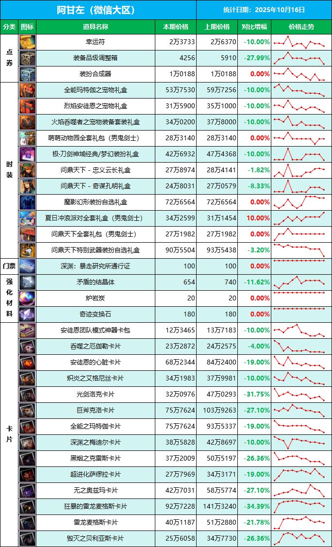 ◆统计时间:2025年10月16日◆统计区服:微信区(阿甘左)、QQ区(克拉赫)◆本统计价格意在探讨交流用,无其他任何商业目的,请勿以表格中的数据定价,另手游物价浮动不大,价格无明显变化的,走势图中将不再展示。◆微信区- 仅仅过了1周时间,附魔卡价格下跌最高达34.39%,最少的也有4%,全面进入低价清仓模式,往后一段时间大概率还会持续下跌,原因无外乎是需求和市场消化减少,同时产出又在
