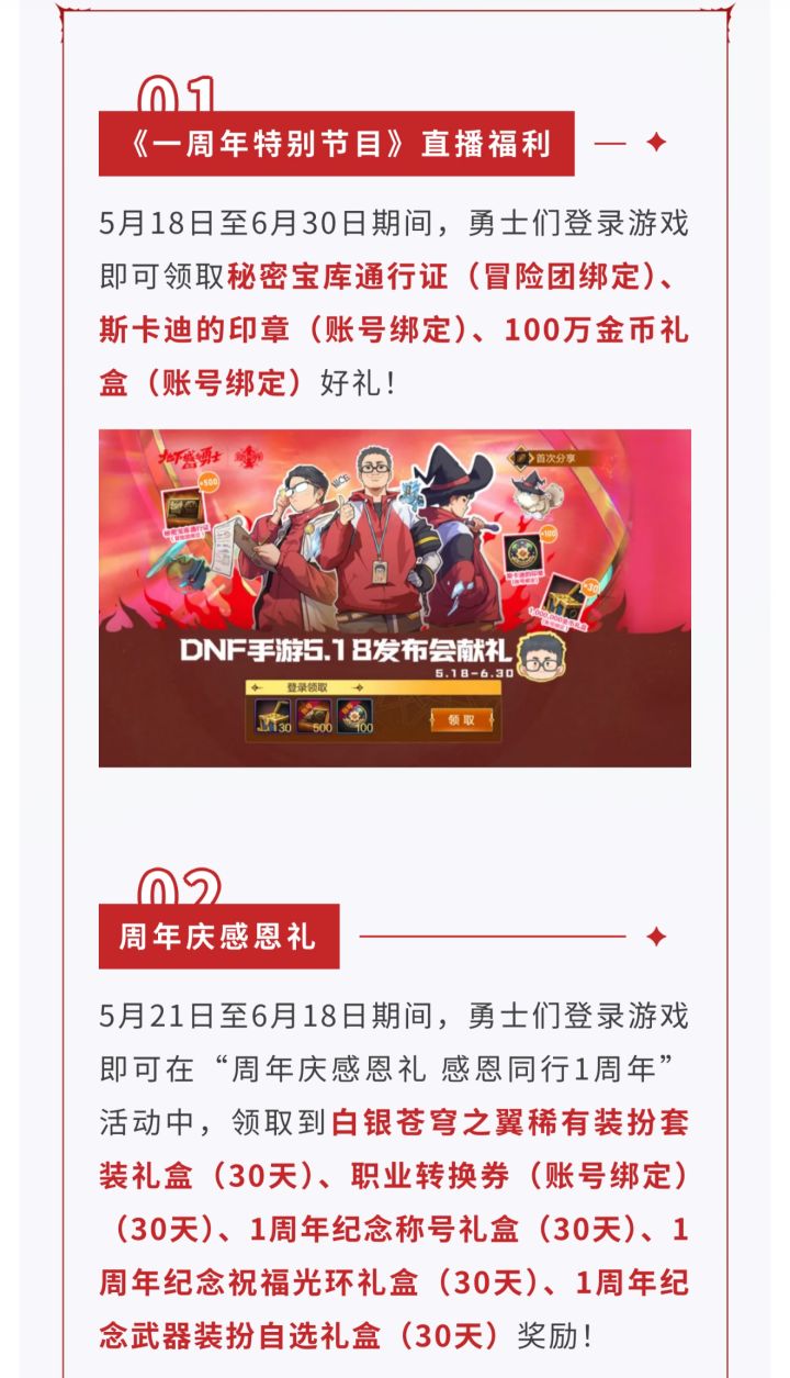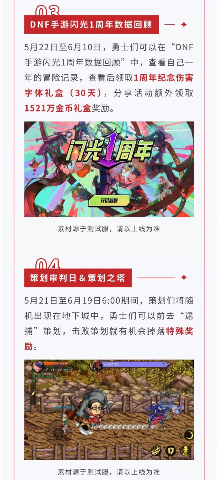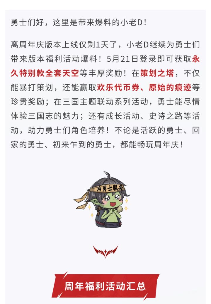 小老D今天继续为勇士们带来版本福利活动爆料!5月21日登录即可获取永久特别款全套天空等丰厚奖励!在策划之塔,不仅能暴打策划,还能赢取欢乐代币券、原始的痕迹等珍贵奖励;在三国主题联动系列活动,勇士能尽情体验三国志的魅力;还有成长活动、史诗之路等活动,助力勇士们角色培养!不论是活跃的勇士、回家的勇士、初来乍到的勇士,都能畅玩周年庆!#dnf手游周年庆 #dnf手游 #地下城与勇士手