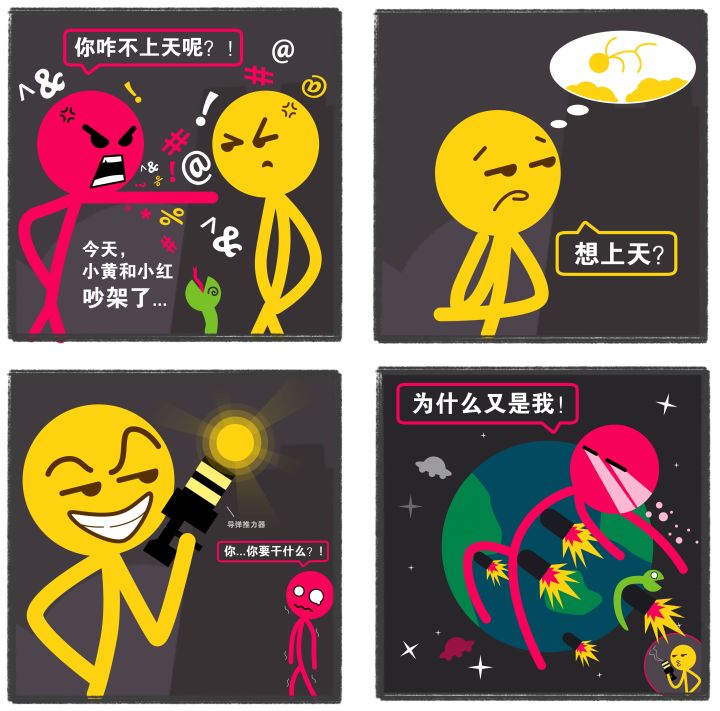 【关于《四大柴子》】不仅想看火柴人?还想看有“柴”的火柴人?火柴人物风云榜Top4的“四大柴子”前来报道!《四大柴子》由精分编辑部——小黄、小红、小绿、小蓝本色出演。柴貌双全为何却惨遭坑害?编辑部友尽互撕为哪般?想了解酱酱酿酿的爆笑日常,记得每周锁定《四大柴子》,带你扒一扒精分编辑部那些不为人知的“内幕”!最近小黄小红在家里上网课,偶尔会发生争执。不过,经过多日修炼,本黄已经摸索出了一套解决办