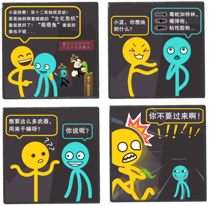 【关于《四大柴子》】不仅想看火柴人?还想看有“柴”的火柴人?火柴人物风云榜Top4的“四大柴子”前来报道!《四大柴子》由精分编辑部——小黄、小红、小绿、小蓝本色出演。柴貌双全为何却惨遭坑害?编辑部友尽互撕为哪般?想了解酱酱酿酿的爆笑日常,记得每周锁定《四大柴子》,带你扒一扒精分编辑部那些不为人知的“内幕”!在刚刚过去的双十二里,因为贫穷,本黄成功逃脱了“剁手”的命运!除了正视自己的贫穷,小黄还