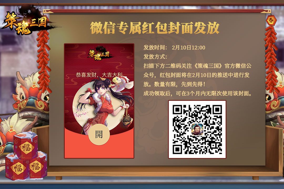各位主公大人好呀,小貂蝉来给大家提前拜年啦!新春将至,感谢大家一直以来的陪伴,小貂蝉在这里祝大家新的一年里万事胜意、心想事成、顺顺利利、健健康康! 听说最近流行起了微信专属红包封面,小貂蝉这边马不停蹄地赶潮流为大家定制了一批《策魂三国》专属红包封面,希望可以陪伴大家一起开开心心过大年~(虽然封面用的是大乔的照片 ̄︿ ̄ ) 总之,非常感激主公们的支持与喜爱,期待新的一年里,小貂蝉可以继续陪伴大家~