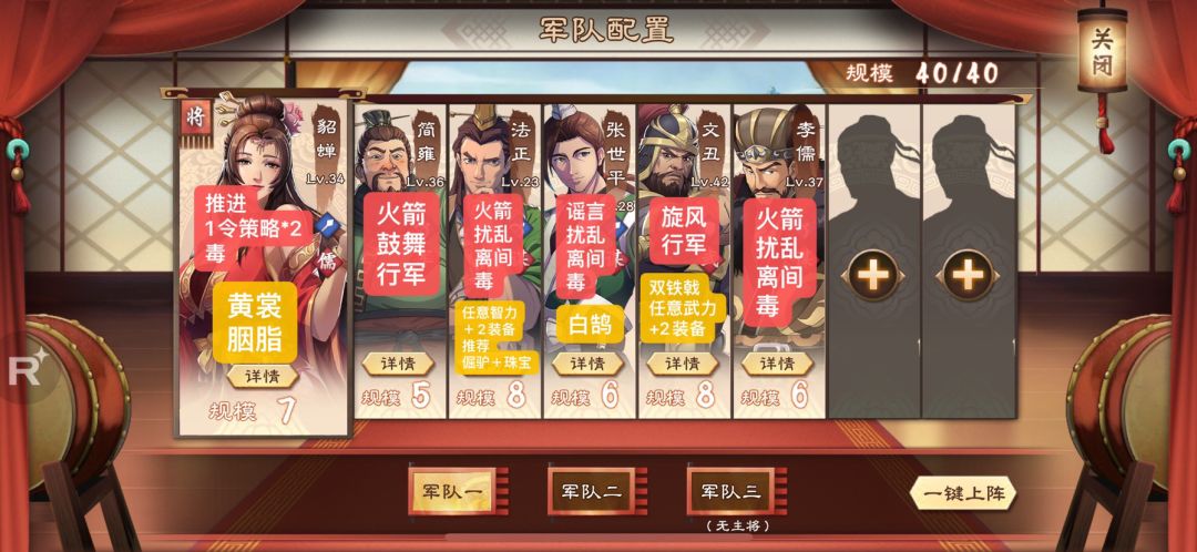 先上阵容技能装备,兵种全员山贼套 第一回合 简雍 原地给貂蝉行军 张世平 占城打粮(其实打不掉,哈哈) 法正 右边打粮(还是打不掉) 其他人走位 第二回合 李儒 上高地毒一个 文丑 上高地给自己行军 貂蝉 走位毒晕骑兵 法正 走位毒一个,优先盾兵 张世平 往回走 简雍 原地回令 蔡文姬 原地卖萌 *这关下方的6个兵走位有时候会抽风,不一定完全一样。 *下方共6个兵,两个盾兵一个骑兵交给法正貂蝉毒和
