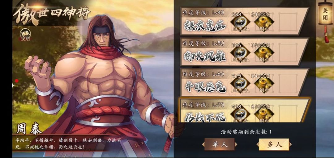 四神将玩法在40级即可解锁,玩家在战斗中挑战被强化过的三国名将,参与活动可以获得白虎令 【解锁条件】 玩家等级达到40级、50级、60级、70级即可解锁相应难度的关卡 【战前准备】 需要在征战界面的军队中配置阵容 【玩法说明】 1.傲视四神将中玩家可以自己或者邀请好友一起挑战。 2.每周挑战次数不限制,但是只能获取一次胜利奖励,挑战的难度越高即可解锁更丰厚的奖励。 3.四个难度挑战的神将不同,每个