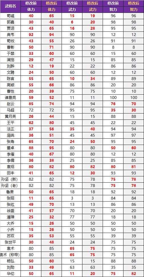 貂蝉:三维与一技能重做(一个战棋游戏,竟然没有再动,太说不过去了)三维:武力70➡️29、智力80➡️83、体力20➡️38。舞姬:消耗自身20%血量,让一个已经行动过的角色再次行动,并且士气加2。武圣技能重做关羽概率100%触发、关银屏50%概率触发。一个1644将,输出靠三分脸?关键刷图还有刑天铠,不是100概率谁还用?曹操:技能重做(这是所有三国游戏黑曹操最厉害的吧)奸雄:使用君