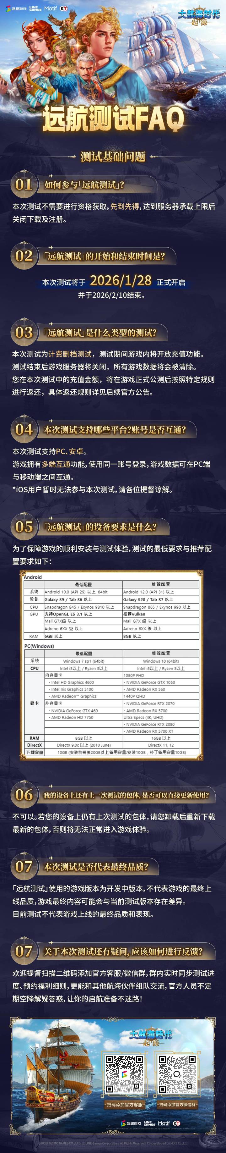 亲爱的提督们:《大航海时代:起源》「远航测试」即将于1月28日开启!欢迎提督们加入16世纪的航海船队,开启乘风破浪的航海之旅!请提督仔细查看下方的测试FAQ,以了解本次测试的常见问题。若有任何无法通过下列答疑解决的问题,欢迎在本帖进行留言回复,信使将会竭诚为大家解答!——《大航海时代:起源》光荣特库摩正版授权、Line Games 与 Motif 共同开发,重温一代人的航海梦——游戏现