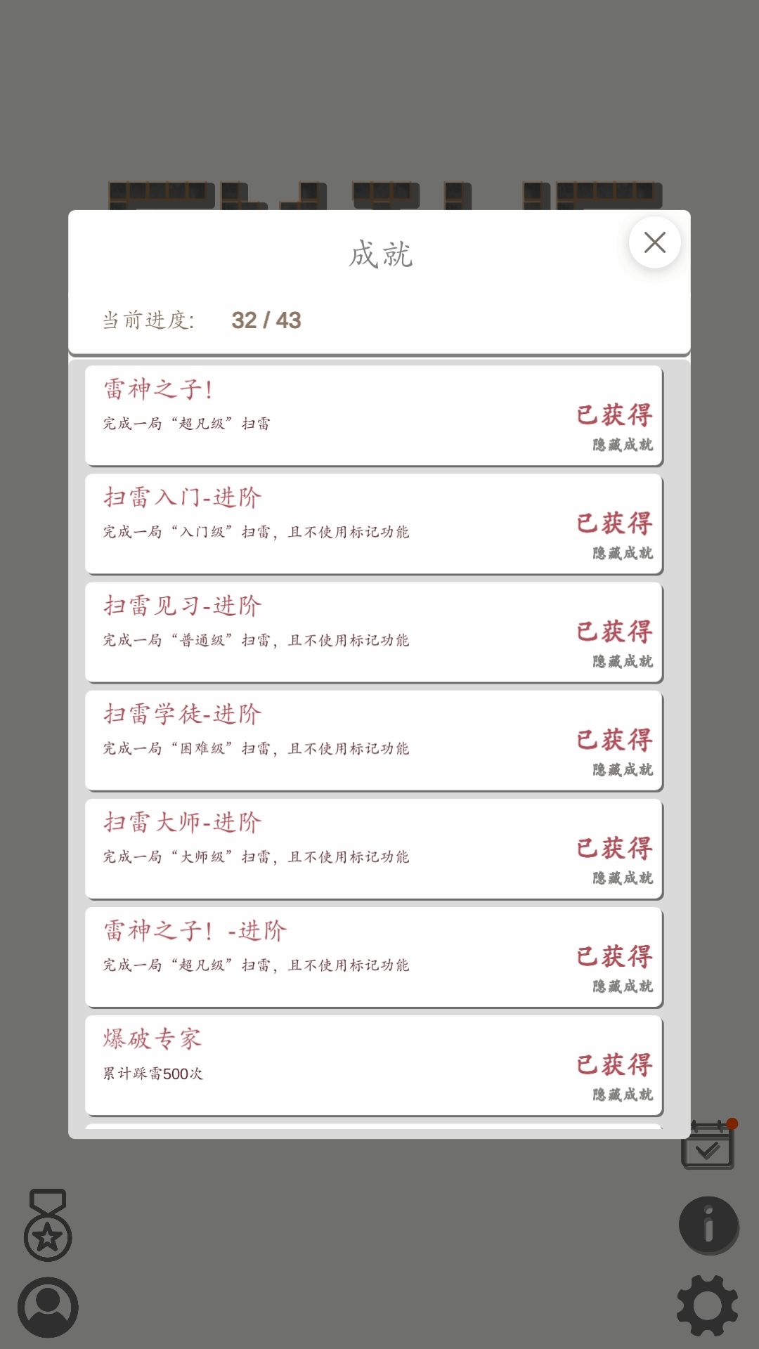 显示的成就有25个,成就总数有43个。 隐藏成就进度(18/18) 目前已知: 新手村扛把子:累计通关“入门级"扫雷100次 雷神之子:通关“超凡级"扫雷1次 二选一之王:累计通关“超凡级"扫雷5次 扫雷入门-进阶:nf通关“入门级"扫雷1次 扫雷见习-进阶:nf通关“普通级"扫雷1次 扫雷学徒-进阶:nf通关“困难级"扫雷1次 扫雷大师-进阶:nf通关“大师级"扫雷1次 雷神之子-进阶:nf通关