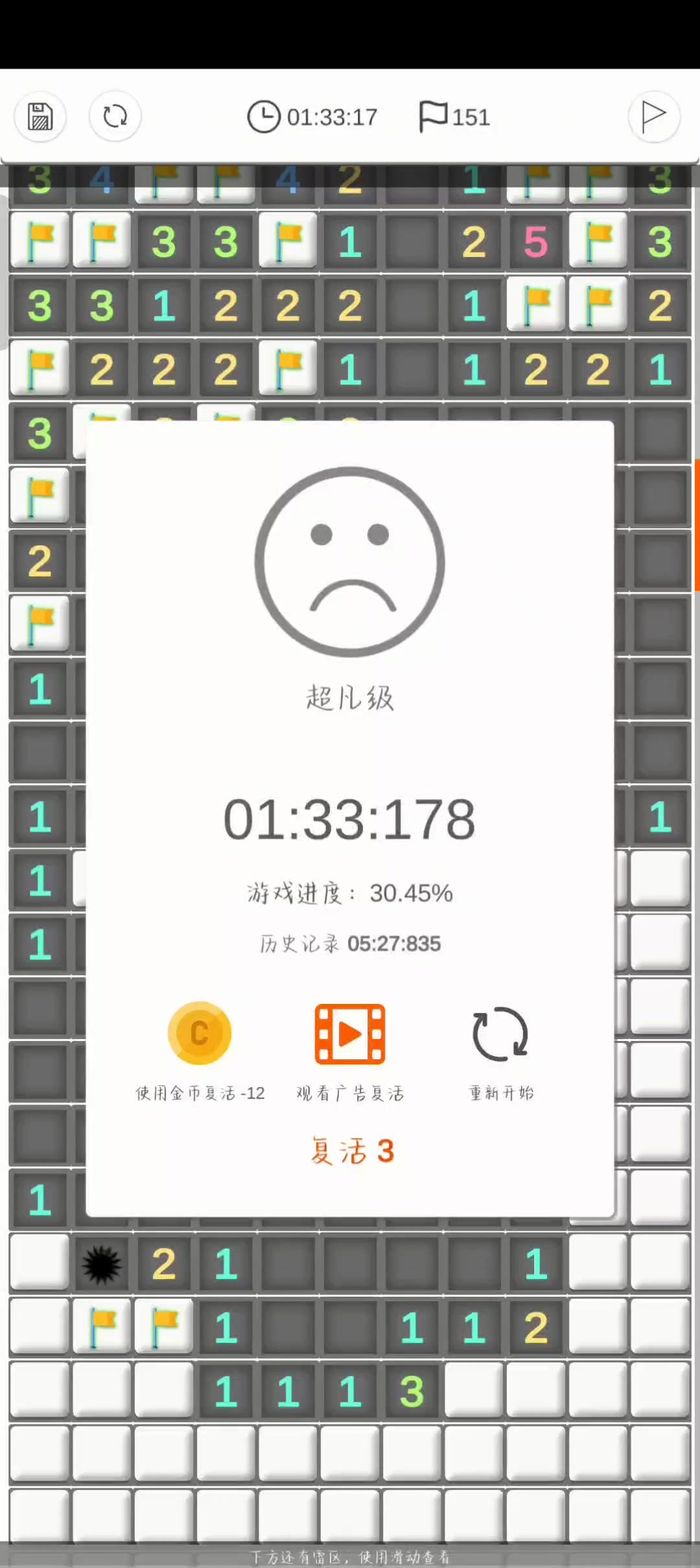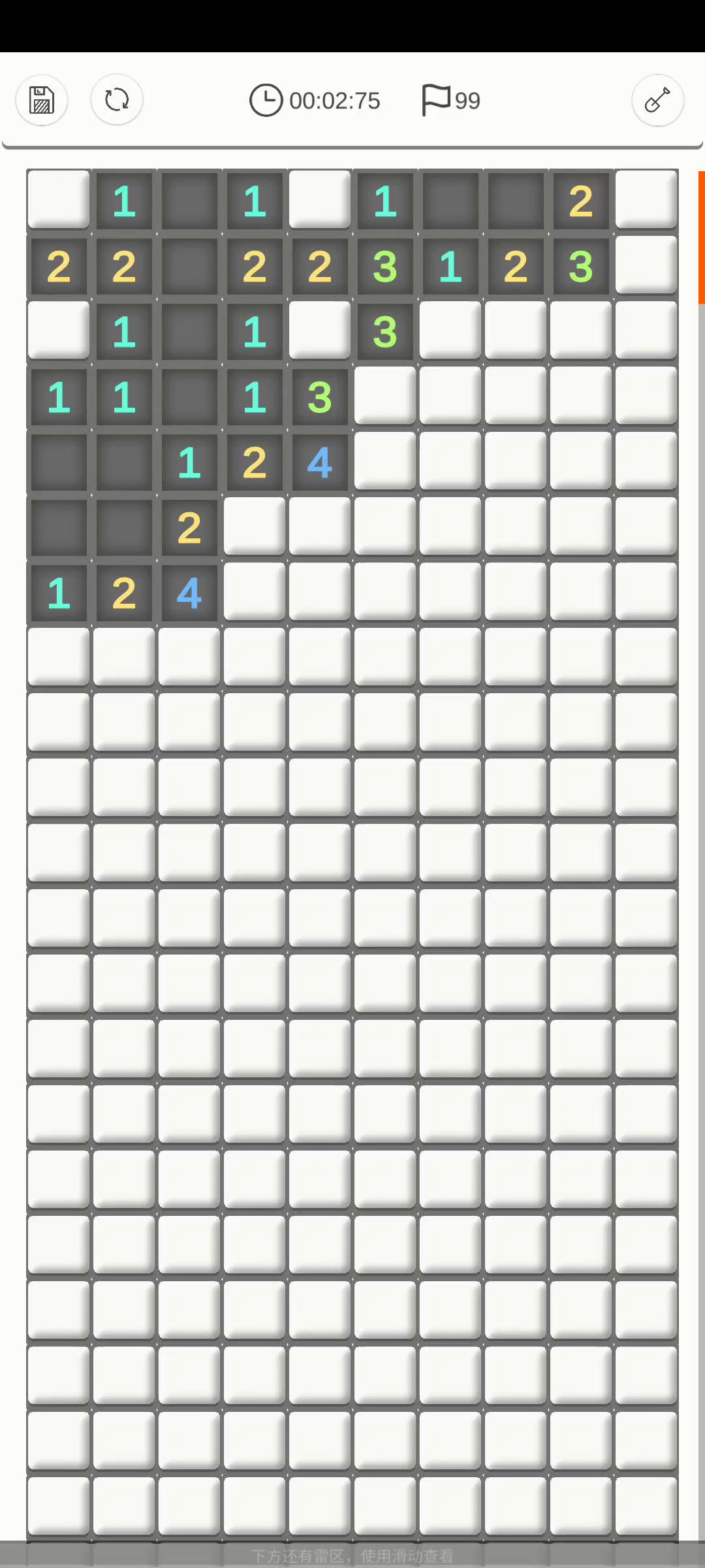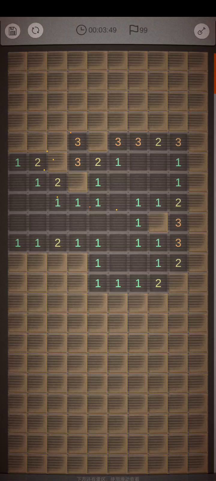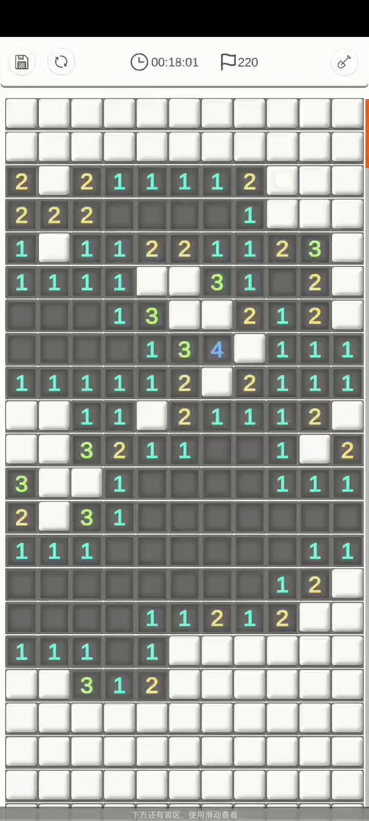 点击和反应都还有些慢,点击方面,比如一横排的三连击,尽量用最快速度哒哒哒一下子点完,按顺序点,我看楼主总是喜欢先点中间再点两边,不要这样。总地来说就是尽量快点儿点反应方面,就是判雷还需要继续熟悉,比如定式变形,判断速度还有很大提升空间,猜雷的时候犹豫时间也略长。还有就是其他方面建议你到设置里把那个滑动惯性关掉,这个玩意纯粹的影响自己以及你玩的时候也注意一下不要那么频繁地去滑动游戏界面,我感觉自从过了第一屏的图之后,你基本是操作几下就拖一下屏幕。还有别走回头路,就是说不要先拽到下面扫完下面,然后又拽回去扫上面,这样会亏划屏时间。排行榜上有大家的录像,2分多的有一些是NF的,可以看看参考一下。(虽然这个录像播放不太舒服)比如我是第16名,2分16其实主要还是多玩呀,快的人都玩了很多年,你练几年也会2分多的