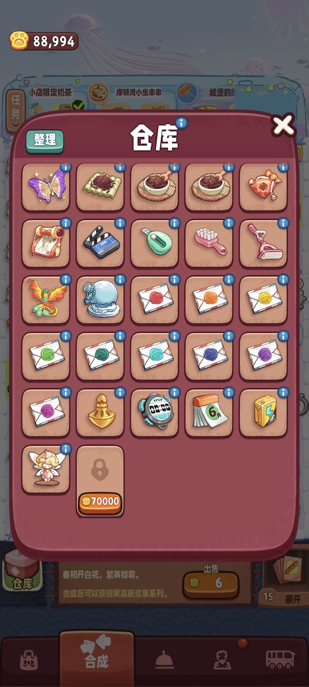 结论: 1.2个n级物品的产量高于合成后1个n+1级物品的产量,很多难拿的物品特别是新手期不要盲目合成拉收藏进度(后续挂机游玩很漫长) 2.自动产出的物品会优先塞满周围8个空格子,没有空格子且自身存储轮数达到上限,便不会再产出。 3.所以邮件等购买道具会优先进入展开中,仓库以及展开中的备用物品不会计时(冷却CD) 4.当物品储存已满而一轮有4个,你却只用了一个时,物品会自动补充,但是依旧补充一轮的