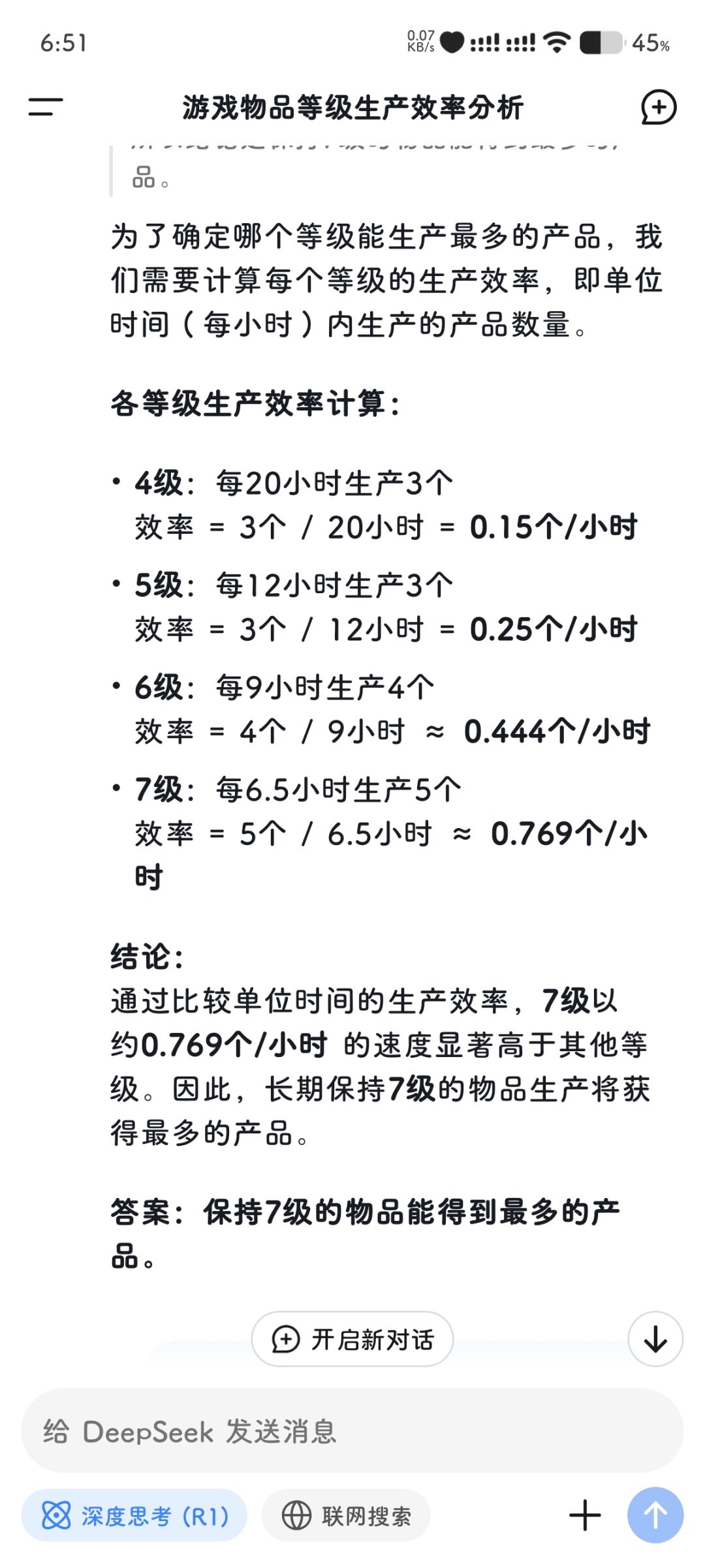 一,先说结论: 1.1 产出速度小于体力回复速度的生产工具,留2个及以上 1.2 每小时产出总量小于40的,需要留多个同等级生产工具补到40份产出量,例如甘蔗等 1.3 无人机(7级)留4个,它的个数比较特殊,不参与分析,但后边会说无人机的作用 1.4 特殊生产工具例如花瓶,果篮,羽毛笔等,永远有且仅有一个,无需考虑 二,为什么是这个判断标准: 2.1 这游戏体力回复速度是每小时30点体力(每2分