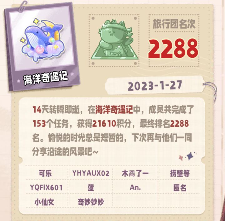 之前呆的旅行团太霸道了,副团长带头抢任务,收藏之后辛辛苦苦准备半天,就被人家上线直接提交...已破防,求氛围和谐的旅行团收留~