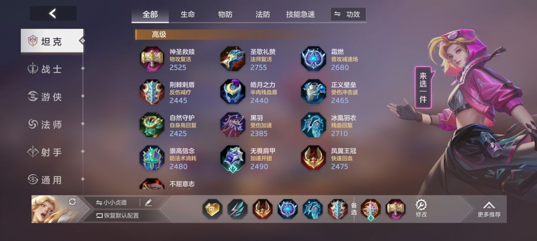 小宝石 小鞋子 然后直接裸大凤凰 抵抗鞋 辅助小斗篷 霜燃 大辅助盾 蓝斗篷 反甲 移速绝对够 走位好一点 细节多一点 出完凤凰 蓝条不空不用回家 超级有续航 我只是想帮着贞德玩家找到好的上分思路罢了 毕竟辅助难上分的时候 只有懂罢了 接受质疑 但请荔枝